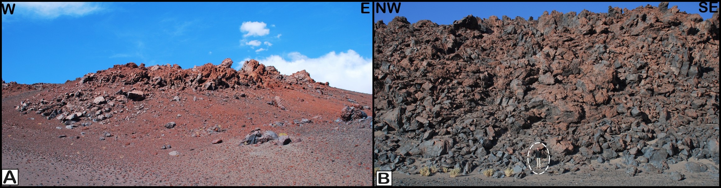 Fig. 8. Panqueque center, effusive unit. A. Reddish lava outcrop from the lower lava sub-unit. B. Gray, blocky lava outcrop from the upper lava sub-unit; note person for scale. |