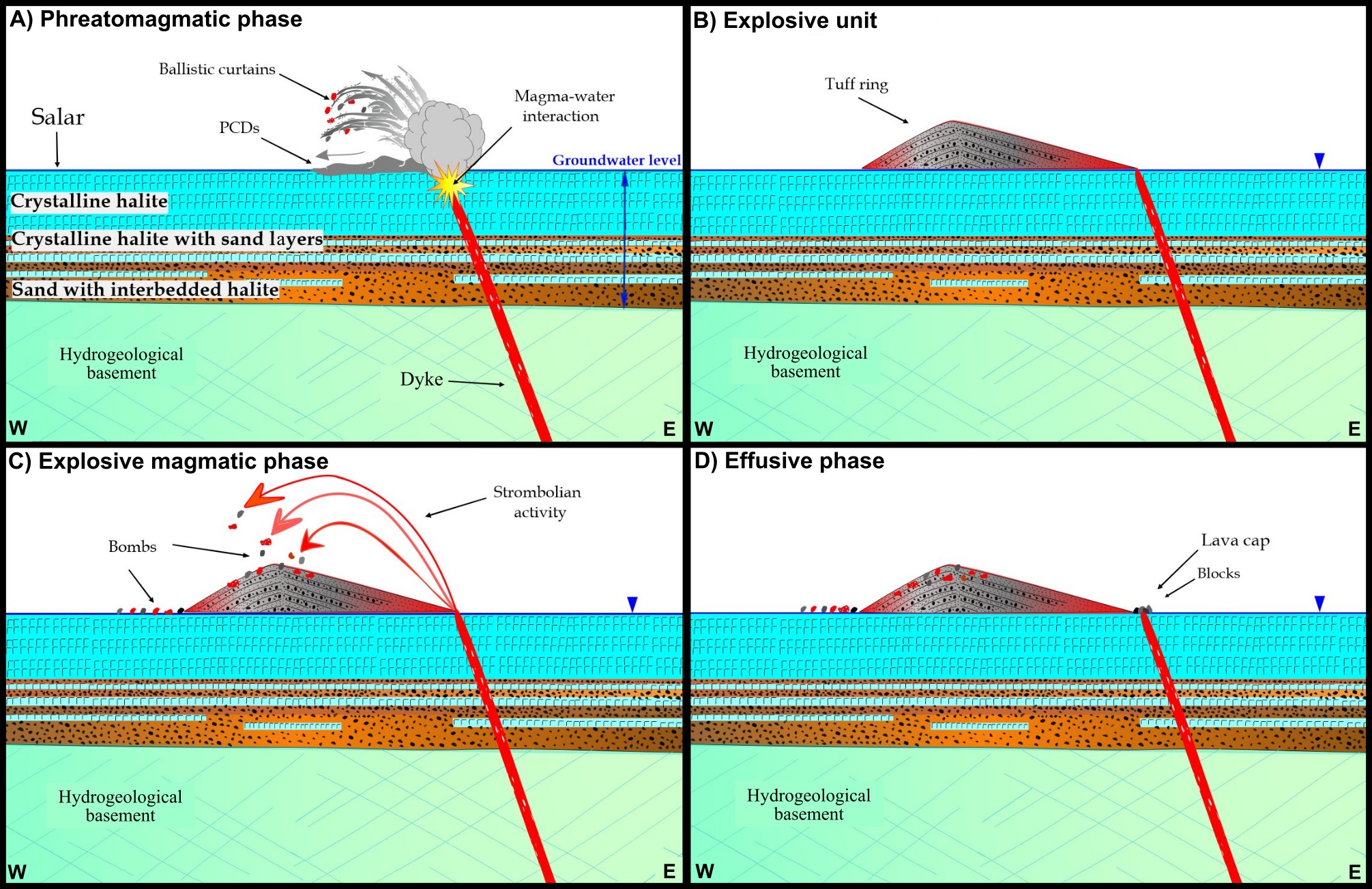 Fig. 15. Reconstruction of the eruptive history of the Medialuna mafic center (not to scale). The stratigraphic profile is inferred based on data from exploration drilling carried out in the Salar de Arizaro (Rosko, 2022). A. Phreatomagmatic activity caused by the interaction between an ascending magma dyke and evaporitic layers saturated in water/brine and/or surface water. B. Formation of an asymmetric tuff ring west of the conduit. C. Emplacement of large bombs and pyroclasts (Strombolian activity). D. Emplacement of a small lava cap in the vent area of the tuff ring. |