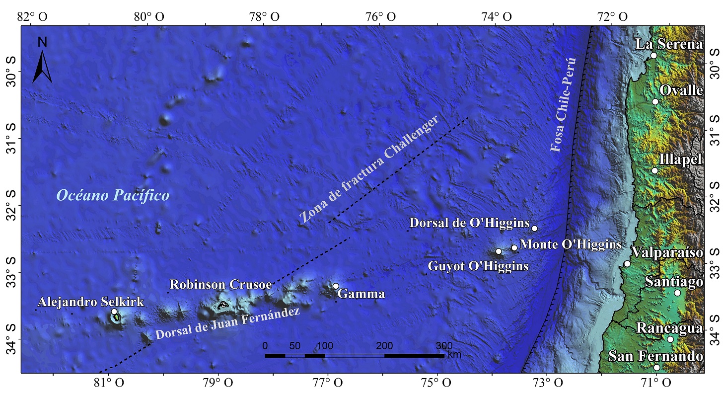 FIG. 1. Zona de estudio en Chile central y el océano Pacífico. Los círculos blancos indican islotes y montes submarinos de relevancia a lo largo de las dorsales de Juan Fernández y O’Higgins. Las líneas negras segmentadas muestran las zonas de fractura más importantes. Batimetría y topografía obtenida a través del modelo ETOPO2 (Amante y Eakins, 2009).
