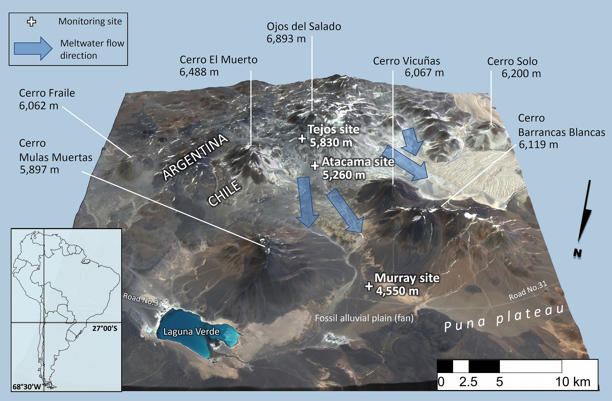 The Tejos site is located ~2.5 km northwards from the OSM at 5,830 m a.s.l., in a mountain tundra periglacial environment. The site is in a flat area amid thick lava flows, moraine ridges, and rock glacier deposits.