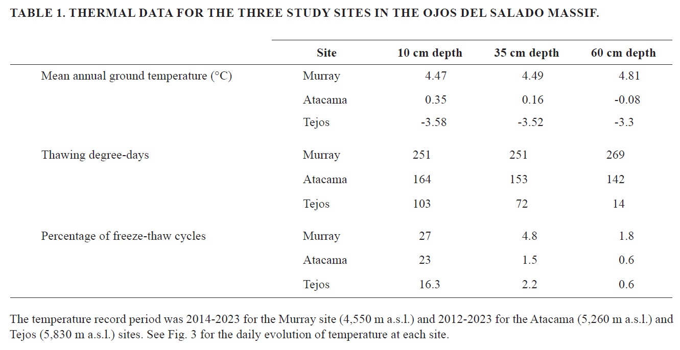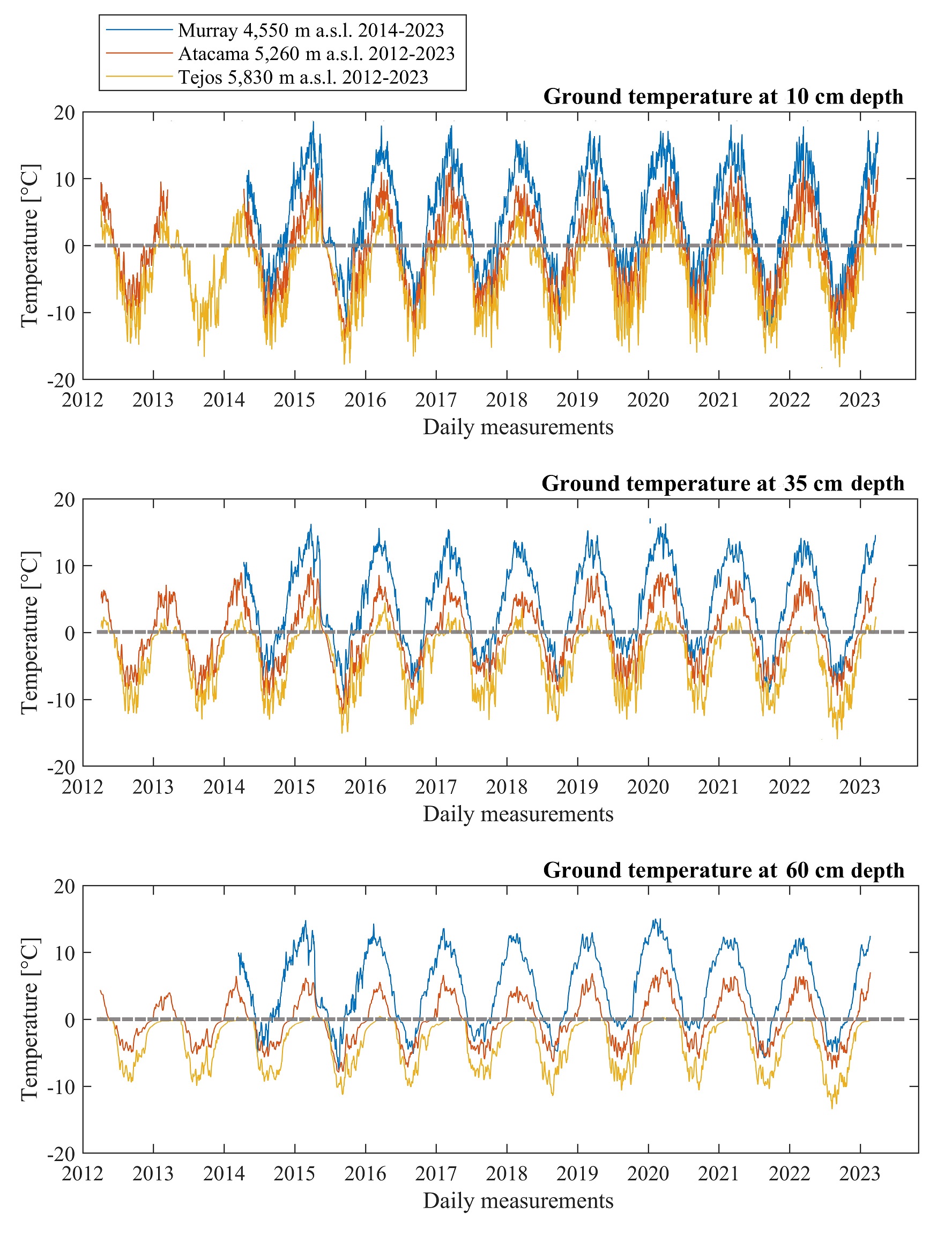The thermal analysis evidences a transition from mountain desert without permafrost (Murray) to a mountain periglacial zone with ice-rich permafrost (Tejos), where the active layer is assumed to be present above ~5,260 m a.s.l. In fact, at Tejos, the thawing degree days are dramatically lower when compared to Atacama and Murray, even though the percentage of freeze-thaw cycle days does not show this contrast as evidently. This aspect is clearly shown in Figure 4 as well, where temperatures at 60 cm depth remained always below 0 °C at Tejos, indicative of either a permafrost-table top or a thermal transition for ice-phase change.