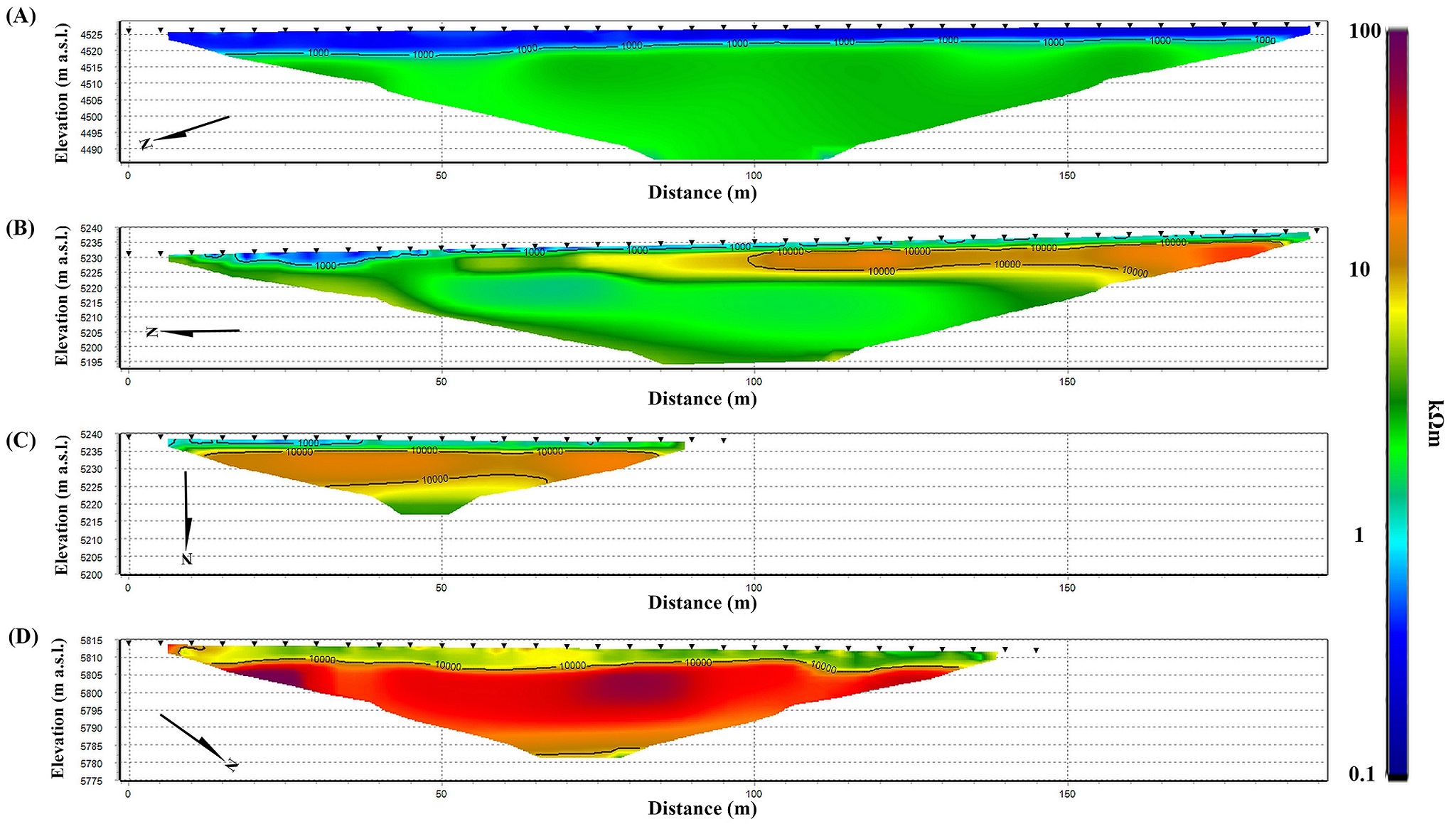 The ERT results do not unequivocally confirm an altitudinal gradient from no frozen grounds (Murray) up to subsurface values common for permafrost bodies (Tejos). However, there is a consistent resistivity increase at Atacama below 3 m depth, reaching values between 15-20 kΩm. Below 20 m depth, there are important differences in the resistivity values and their spatial extent for all sites. For example, at Murray, there is a large continuous body <5 kΩm, while at Atacama there are lens-like bodies with resistivities of up to 20 kΩm above a less homogeneous <5 kΩm domain. The high-resistive features in the Atacama site thin northwards and longitudinally (Fig. 5C), while at Tejos, in contrast, the predominant subsurface feature is a highly resistive body reaching even 100 kΩm in certain parts.