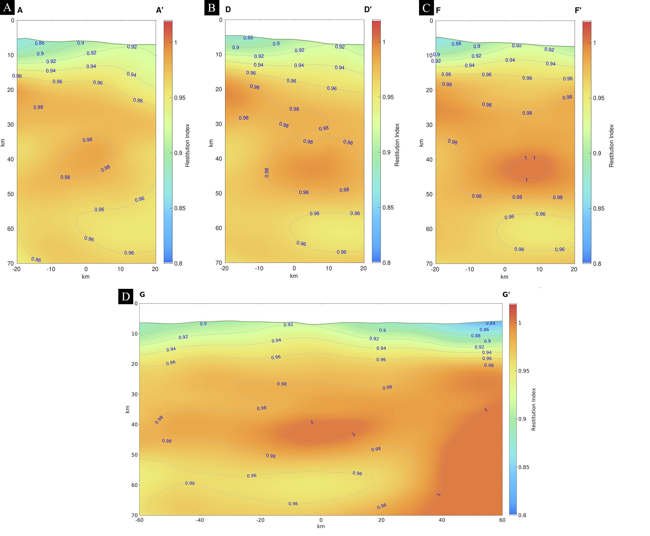 The model resolution results are shown in figure 3 along some of the profiles from Figure 1. In general, the resolution is high in the Abitagua Batholith area. The minimum RI is 0.84 and the maximum even reaches the value of unity (Fig. 3D). This high resolution is explained due to the significant seismicity recorded in the area for the 1988-2016 period (Fig. 2).