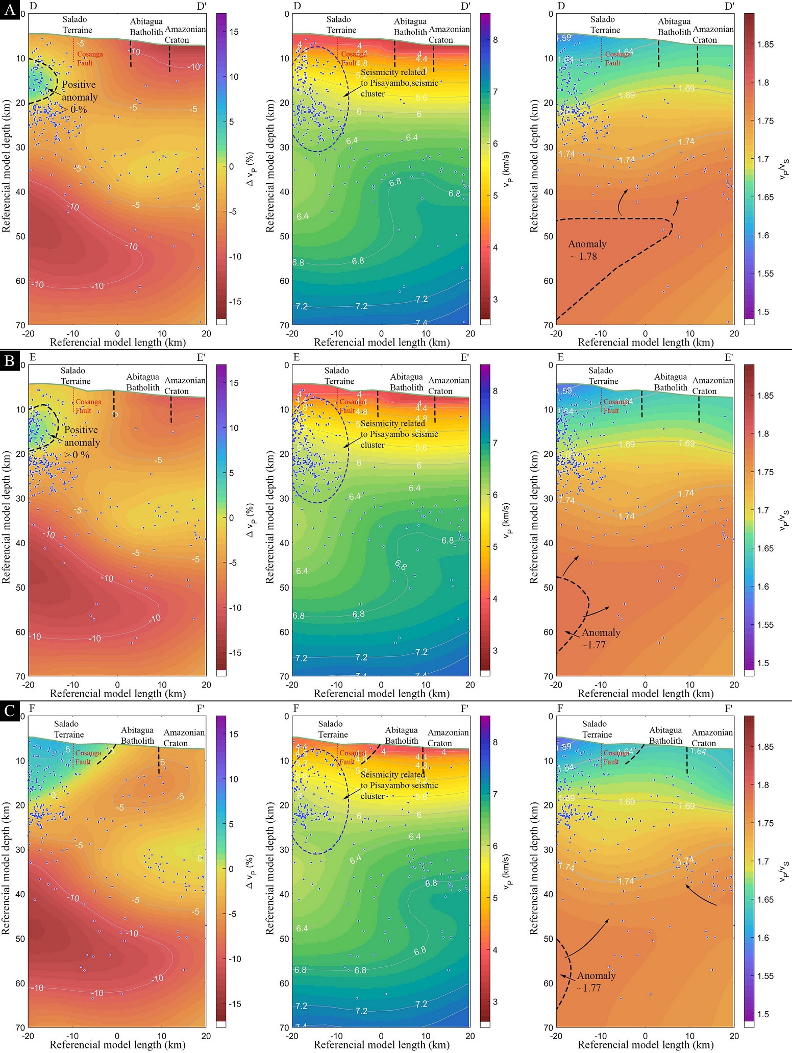 Fig. 5. Seismic model results: ΔVp (in percentage form), Vp (km/s), and Vp/Vs (dimensionless) along sections A: DD’, B: EE’, and C: FF’ (see section location in Fig. 1). Along the surface, the main morphotectonic units (after Litherland et al., 1994) are indicated. Some relevant anomalies (dotted contours) and seismic event hypocenters (blue dots) are also shown.