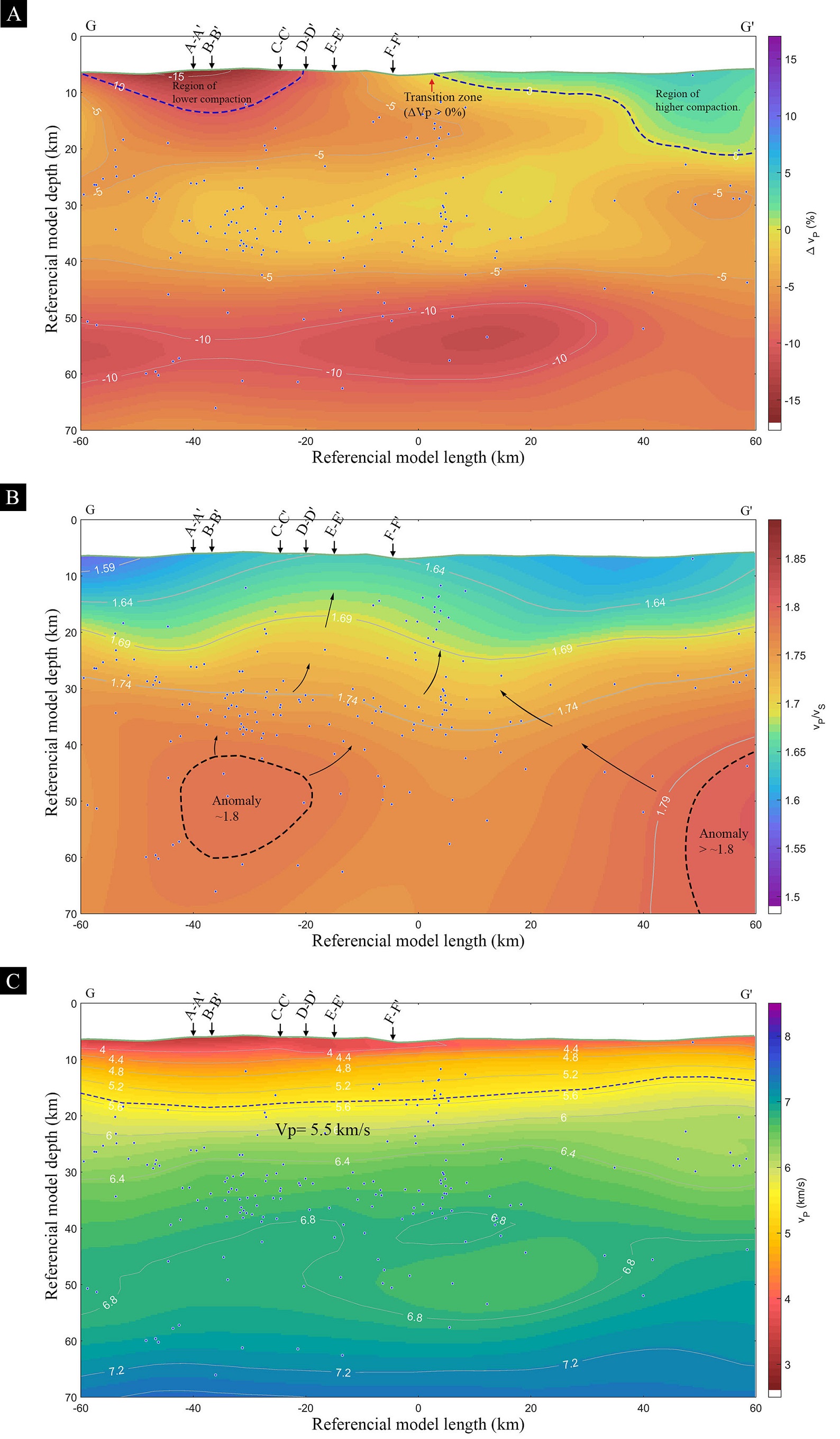 The Vp/Vs model results can be used to determine the crustal architecture associated with volcanoes and shallow intrusions (e.g., Hua et al., 2019). At greater depths, on the other hand, the S-wave velocity values are typically low in the presence of partial melts, so the Vp/Vs ratio is directly affected, resulting in higher ratios sometimes associated with the presence of magmatic reservoirs (Koulakov, 2012, 2013; Ferri et al., 2016; Vargas et al., 2017; Yang et al., 2023). In the profiles obtained in the present study, it is possible to observe a Vp/Vs anomaly at around 1.77-1.79, at ~45 km depth and below (Figs. 4 and 5). This distribution is more evident in section GG’ (Fig. 6C), in which even a second anomaly can be observed. The first one locates below sections AA’ to FF’ between ~40-60 km depth, while ~80 km to the north, a second, much larger anomaly encloses Vp/Vs ratios above 1.8.
