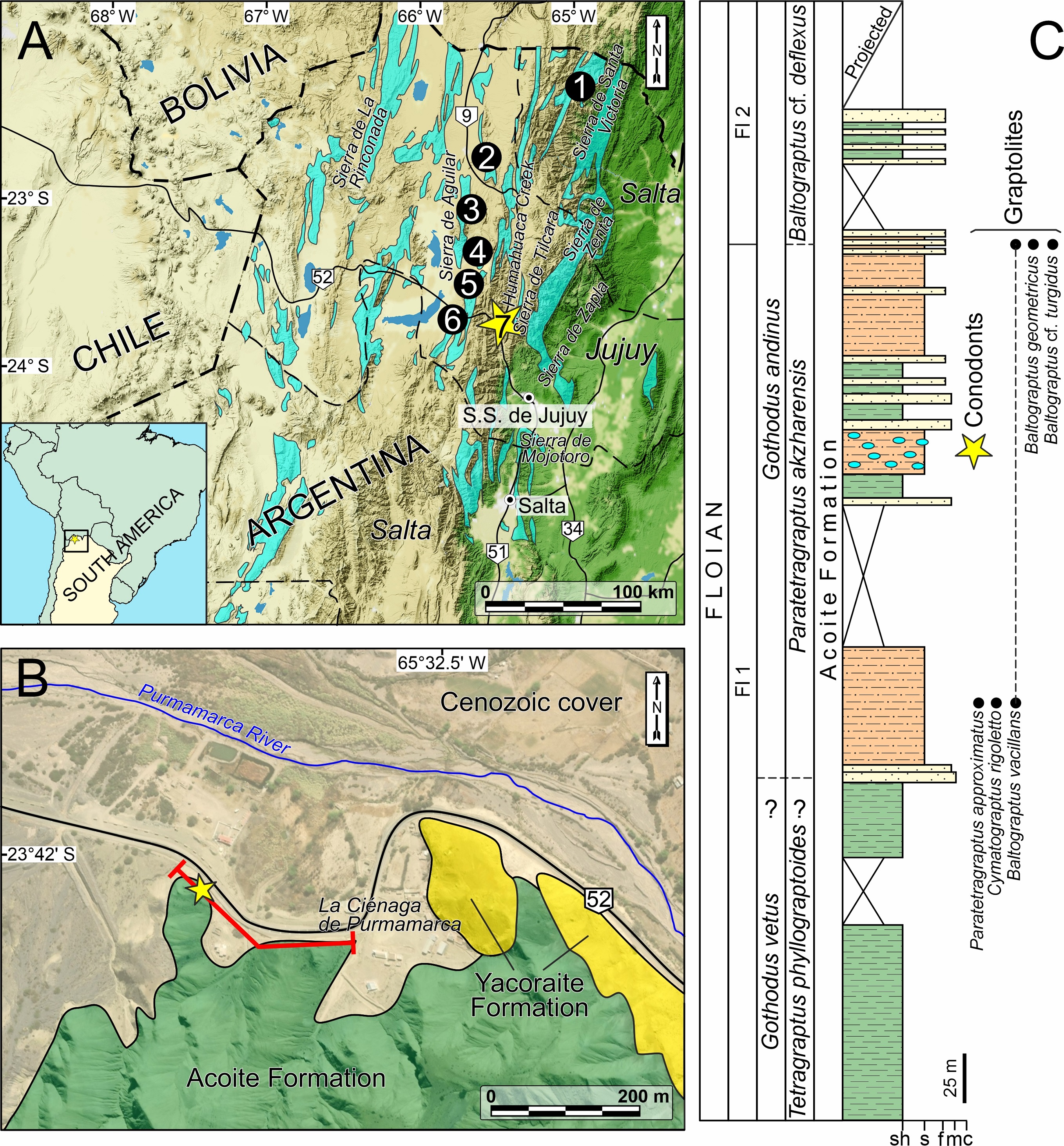 The first ones to document conodonts from the Acoite Formation at the La Ciénaga de Purmamarca were Rao et al. (1994). They referred the conodonts to the Billingenian Regional Stage (upper Latorpian) of the Oelandian Series of southern Sweden. The Billingenian Stage comprises the Oepikodus evae, Trapezognathus diprion and Microzarkodina russica conodont interval zones (Bagnoli and Stouge, 1997; Stouge et al., 2020), representing the upper part of the Floian Global Stage in Scandinavia and the East Baltic area (Goldman et al., 2023; Nielsen et al., 2023). Quoting Rao et al. (1994), the graptolites “Didymograptus (s.l.) aff. demissus (Törnquist, 1901), D. (s.l.) cf. simulans Elles and Wood (1901) and D. (Corymbograptus) aff. vacillans (Tullberg, 1880)” from the La Ciénaga de Purmamarca could represent an age equivalent to the Tetragraptus phyllograptoides Zone (Fl 1). However, the presence of Baltograptus vacillans, index species of the homonymous graptolite biozone in Scandinavia (Maletz, 2023), suggests a slightly younger age for the graptolite bearer levels (Ortega et al., 2003). Based on a similar conodont assemblage, Rao (1999) established the Baltoniodus crassulus andinus-Drepanoistodus pitjanti Association Zone of early Arenigian age in the Espinazo del Diablo and Cajas sectors. Although Rao (1999) referred the conodont-bearing levels to the Sepulturas Formation, they correspond to the Acoite Formation instead, following the nomenclatural revision of Vaccari et al. (2006) and Toro et al. (2017).