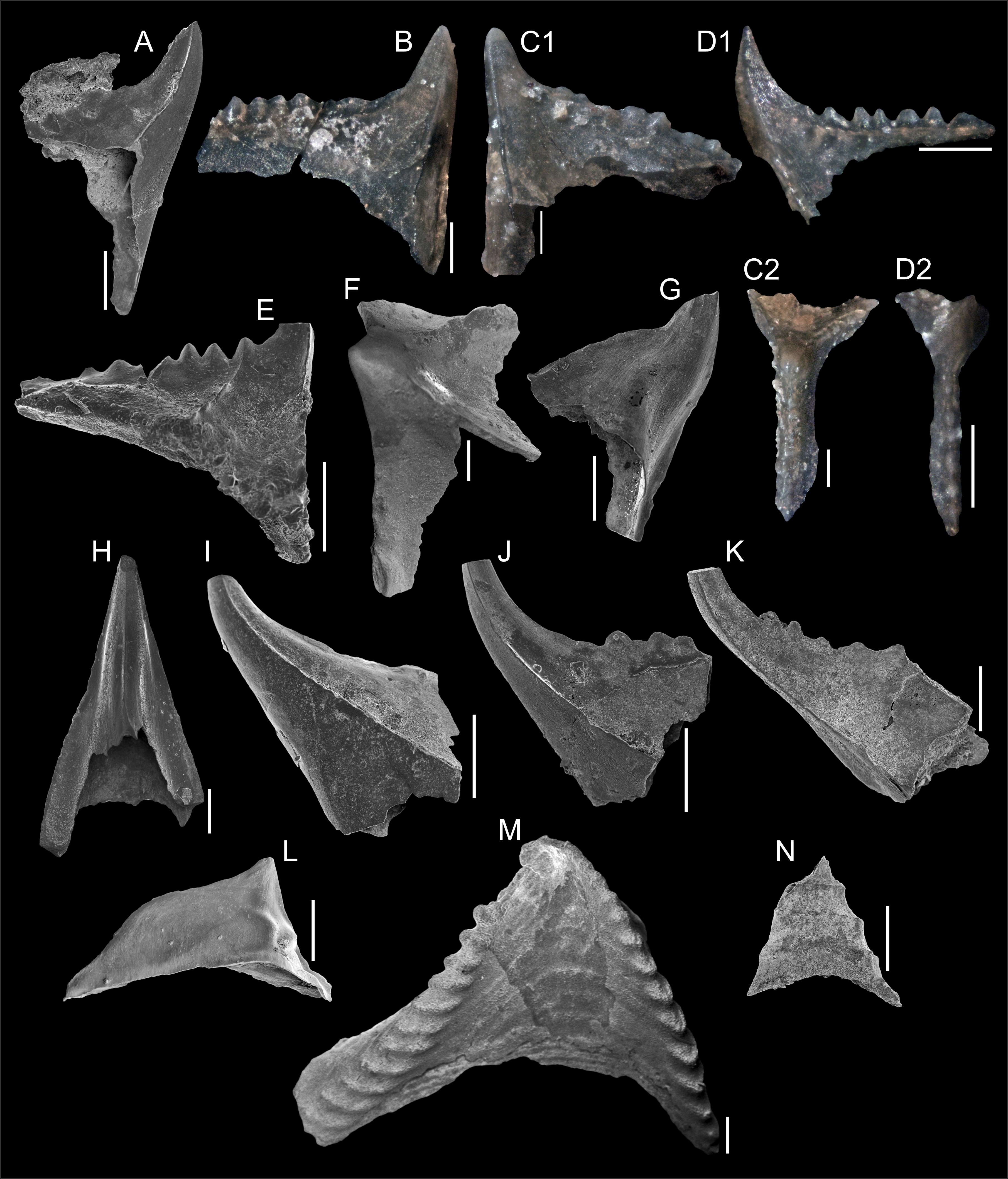 Fig. 4. SEM images (unless otherwise stated) of conodonts from the La Ciénaga de Purmamarca area. A-K. Zentagnathus argentinensis (Rao et al., 1994). A. Pa element, CEGH-UNC 27705; B. Pa element, CEGH-UNC 27706, optical image; C1-C2. Pa element, CEGH-UNC 27707, optical images in lateral (C1) and upper view (C2); D1-D2. Pa element, CEGH-UNC 27708, optical images in lateral (D1) and upper view (D2); E. Pb element, CEGH-UNC 27709; F. Pb element, CEGH-UNC 27710; G. M element, CEGH-UNC 27711; H. Sa element, CEGH-UNC 27712; I. Sb element, CEGH-UNC 27713; J. Sb element, CEGH-UNC 27714; K. Sd element, CEGH-UNC 27715. L. Balognathidae indet., Pb element (basal filling?), CEGH-UNC 27716. M-N. Kallidontus nodosus Pyle and Barnes (2002), M. Pb element, CEGH-UNC 27717; N. Pa element, CEGH-UNC 27718. All scale bars are 100 μm.