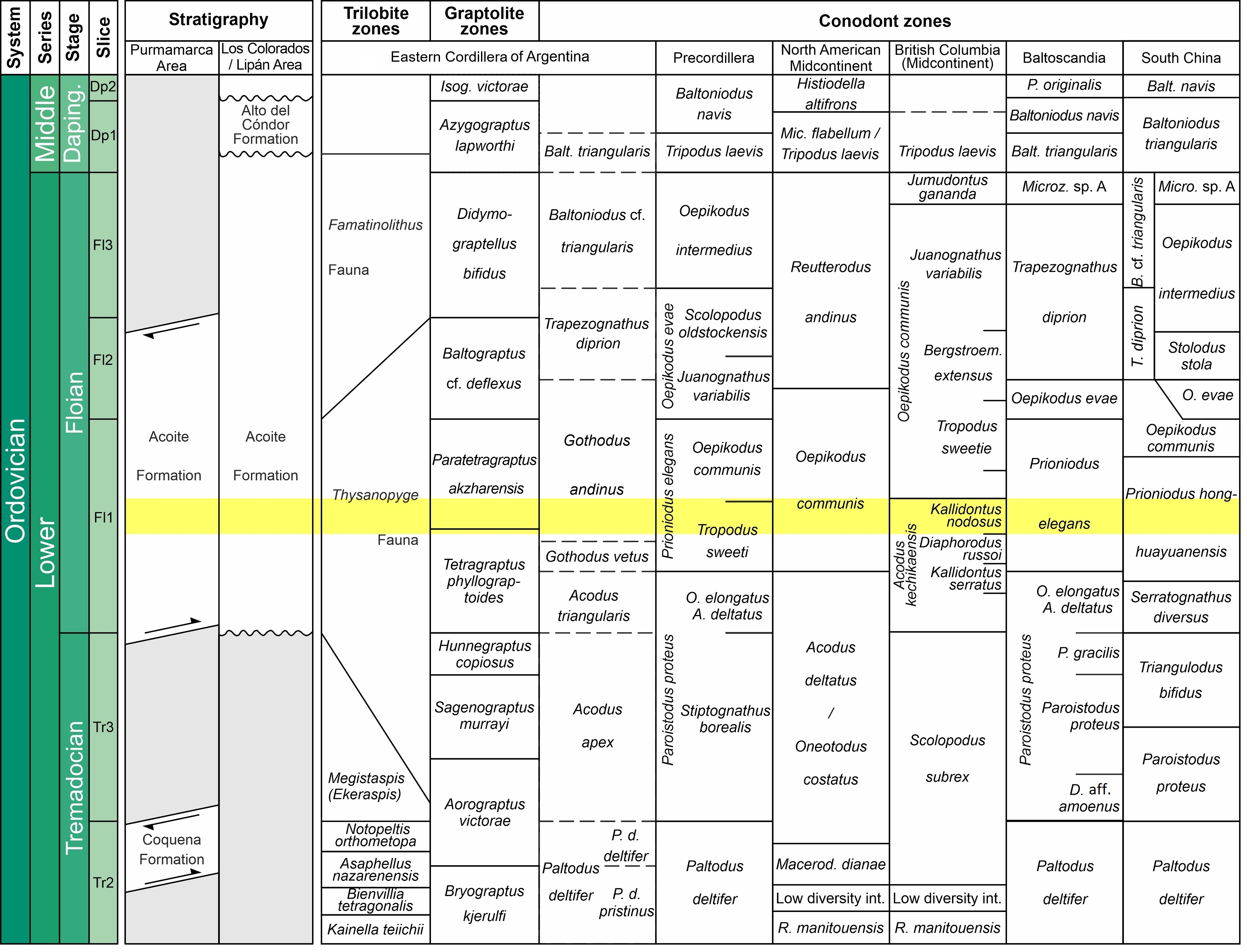 In the Precordilleran scheme, the Prioniodus elegans Zone is well documented in the San Juan Formation, where it has been subdivided into the Tropodus sweeti and the O. communis subzones (Albanesi et al., 1998; Albanesi and Ortega, 2016; Mango and Albanesi, 2020). These subzones approximately correlate with the upper part of the Paratetragraptus approximatus Zone and the P. akzharensis zones of the North America graptolite scheme (e.g., Stouge and Bagnoli, 1988; Goldman et al., 2023; Maletz, 2023), respectively. Stratigraphically above, the base of the overlying Oepikodus evae Zone marks the base of the middle Floian (Fl 2) and partly correlates with the base of the Baltograptus. cf. deflexus Zone in the Eastern Cordillera (Bergström et al., 2009; Waisfeld et al., 2023) (Fig. 5).