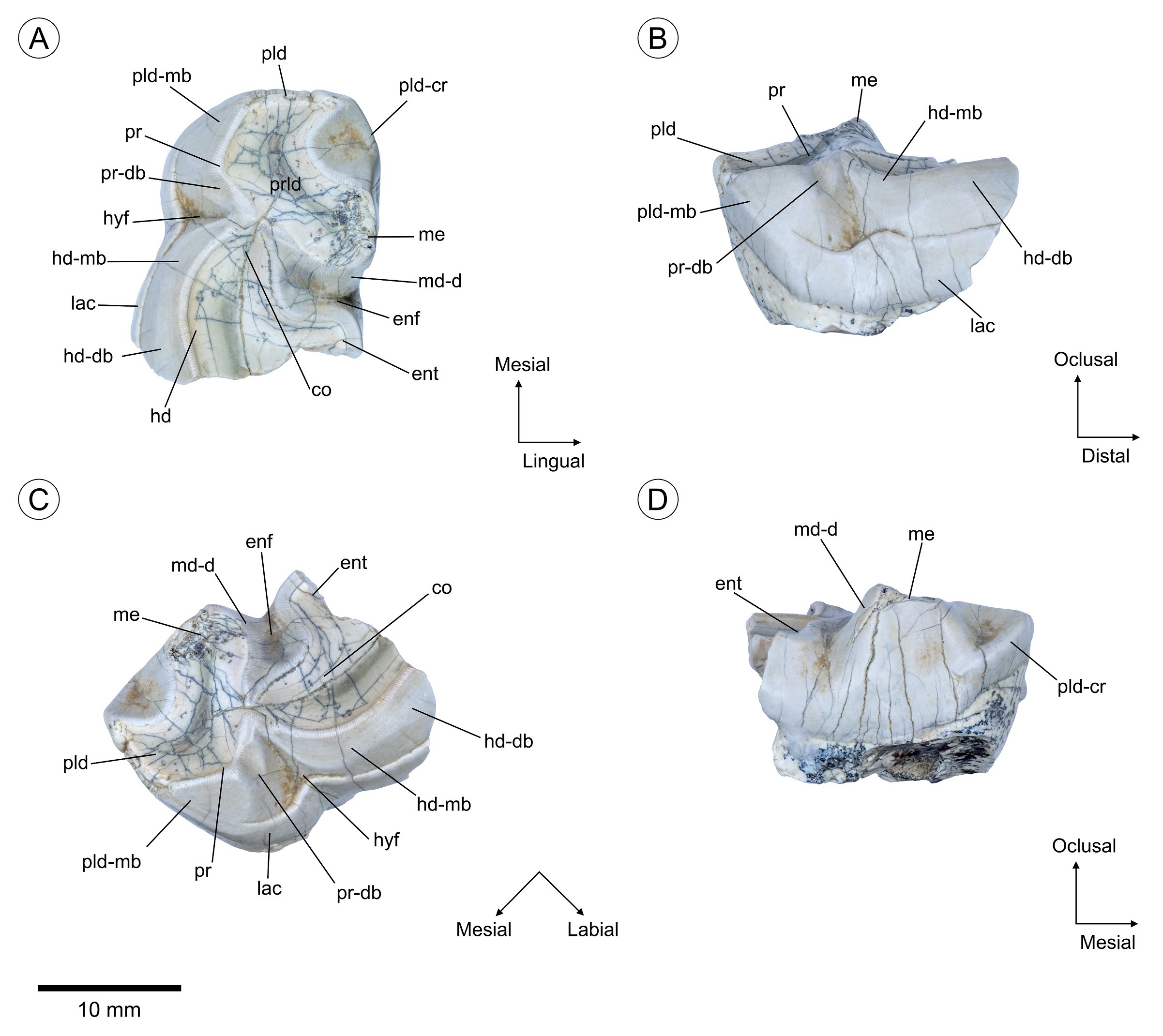 Anatomical abbreviations: co: cristid obliqua, cus: cuspule, enf: entoflexid, ent: entoconid, hd: hypoconid, hd-db: hypoconid distobuccal wear facet, hd-mb: hypoconid mesiobuccal wear facet, hyf: hypoflexid, lac: labial cingulid, m: lower molar, md-d: metaconid distal wear facet, me: metaconid, pld: paralophid, pld-cr: paralophid lingual cristid, pld-mb: paralophid mesiobuccal wear facet, pr: protoconid, pr-db: protoconid distobuccal wear facet, prld: protolophid, wle: wrinkled lingual enamel.