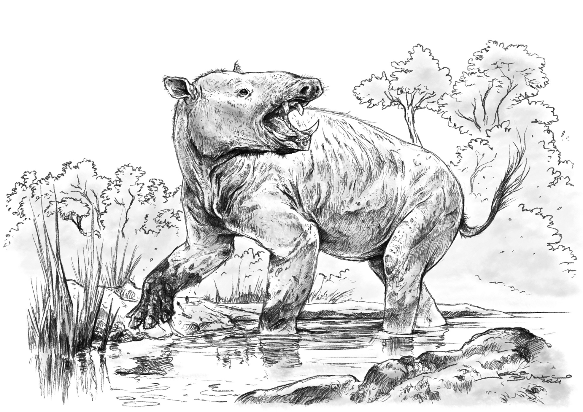 Fig. 6. Idealized artistic reconstruction of Albertogaudrya unica at the Eocene coastal plain in Sierra Baguales, Última Esperanza Province, Magallanes, Chile. Illustration by Jorge Blanco.