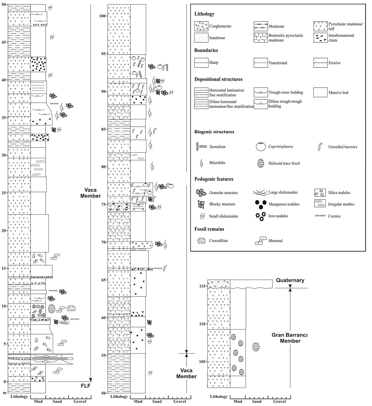 Dissimilarities between ‘Barrancan’ and ‘Vacan’ faunal associations, and the affinity between the last and the ‘Riochican’ preserved in the upper Río Chico Group, could indicate a hiatus separating both ‘Casamayoran’ Subages (Cifelli, 1985). According to Goin et al. (2012), the temporal value of this hiatus would be 2 m.a. (44-42 Ma). Notwithstanding, sedimentologic observations presented herein do not support such interpretations. General stacking pattern and similar facies, repeated arrangement of the same pedotypes and absence of bounding surfaces, point to a transitional contact between CVM and GBM and comparable depositional landscapes. In addition, any paleosol of the entire succession is sufficiently developed to involve a prolonged lapse; despite of time of pedogenesis is always greater than time of sedimentation (Retallack, 2001a). Compared to similar examples from the type locality, where properties and chronologic significance of discontinuity surfaces are known (Bellosi, 2010a, b), the boundary between CVM and GBM at Cañadón Vaca area imply a short time. Accordingly, it is suggested that if it exists, there would be a non significant hiatus between ‘Vacan’ and ‘Barrancan’ associations.