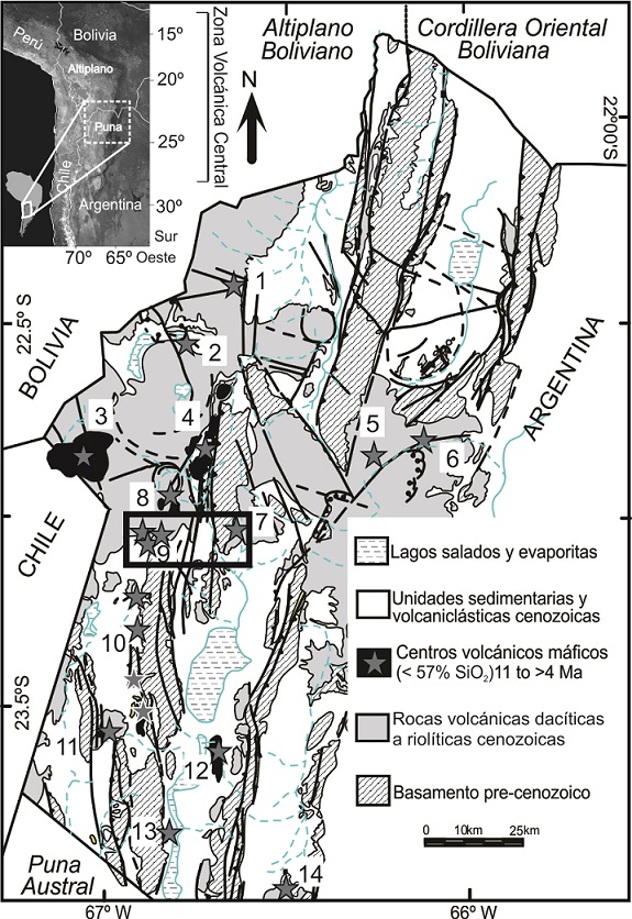 Fig. 1. Mapa geológico de la Puna norte argentina y ubicación de los principales centros volcánicos máficos (andesitas basálticas y andesitas con < 57% SiO2). 1. Pabellón; 2. Pululus; 3. Bitiche; 4. Cerro Morado; 5. Barro Negro; 6. Rachaite; 7. Campo Negro; 8. Patahuasi-Pairique; 9. El Toro; 10. Jama; 11. Tropapete; 12. Cerro Negro; 13. Porvenir; 14. Tuzgle. El recuadro negro indica los centros volcánicos estudiados en este trabajo (7 y 9). Modificado de Caffe et al. (2012). |