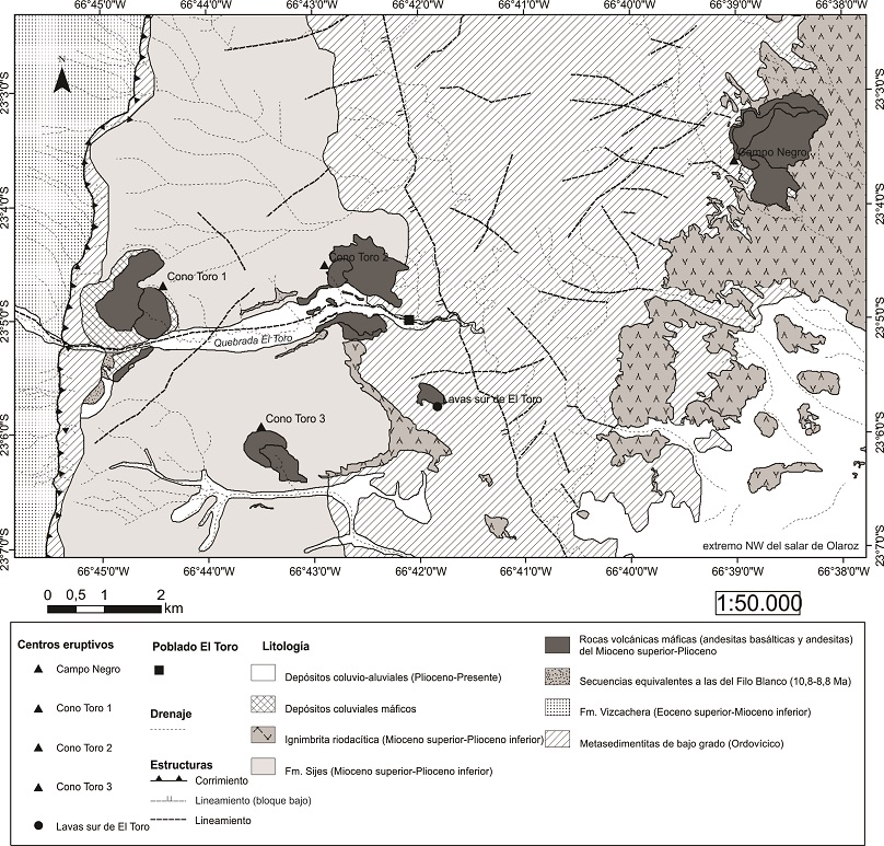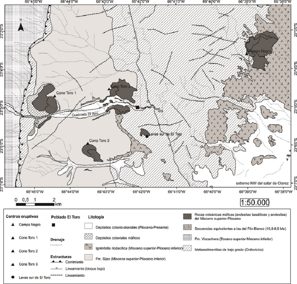 Los conos de escoria han sido denominados Cono Toro 1, 2 y 3, ubicados a ~3 km uno del otro en dirección W y SW del poblado El Toro (23º05’S-66º42’W). El cono restante se llama Campo Negro y se encuentra ~6 km al NE de El Toro (Fig. 2). Los dos primeros edificios están emplazados en una zona que parece ser la intersección de estructuras submeridianas con otras de orientación casi E-W, como la quebrada El Toro (Fig. 2). Por otro, lado el centro eruptivo Campo Negro se emplaza directamente sobre un bloque de basamento ordovícico, con un aparente control de lineamientos de rumbo NW-SE y NE-SW. Las dimensiones de los conos varían en los distintos centros eruptivos estudiados, entre 600 m (Cono Toro 1) y 150 m de diámetro (Campo Negro), y 110 m (Cono Toro 1) a 20 m (Campo Negro) de altura. Estas dimensiones reflejan un grado de erosión relativamente avanzado para las estructuras volcánicas estudiadas, las que, sin embargo, preservan en su mayoría rasgos suficientes para hacer una adecuada caracterización volcanológica.