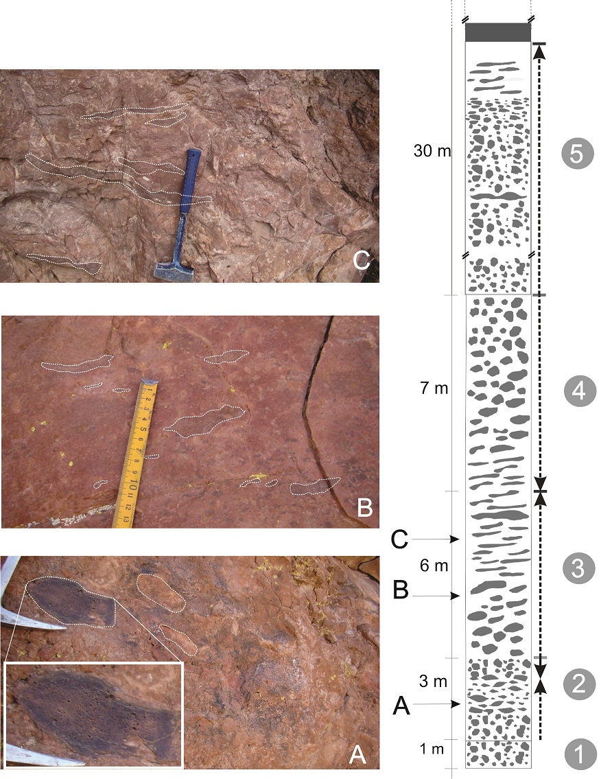 Los depósitos de la litofacies A mejor preservados se encuentran en posiciones externas de los edificios volcánicos principales, buzando en dirección de la propia ladera del volcán (Fig. 6E). A su vez, las bombas fusiformes acomodan su eje mayor con ángulos de reposo de ~25º. Esta litofacies también se encuentra en posiciones más internas de los conos, aunque intercalando con depósitos de la litofacies B, a los que pasa gradualmente. En Campo Negro la litofacies A está muy poco representada debido ya sea a la fuerte erosión que sufrió el cono de escorias o bien a que el depósito tuvo originalmente menor volumen.