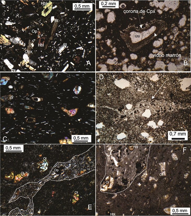 Fig. 8. Fotomicrografías de algunas rocas de El Toro. Las abreviaturas de las especies minerales son según Kretz (1983). A. Lavas porfíricas de Campo Negro, con fenocristales de Hbl, Opx, Pl, Op y Bt, en una pasta vítrea rica en microlitos de Pl; B. Xenocristal de Qtz rodeado por una corona de reacción compuesta por vidrio marrón y microcristales de Cpx; C. Lava del Cono Toro 2 compuesta fundamentalmente por 10-15% de fenocristales de Ol, en una pasta vítrea con textura pilotáxica, rica en microlitos de Pl; D. Textura microscópica de los piroclastos aglutinados de la litofacies B, donde se observa un clasto tipo ‘fiamme’ de tonalidad más blanquecina que la pasta homogénea de aspecto lávico que lo rodea; E. Litofacies L3 (Cono Toro 1). Se destaca la presencia de fenocristales completos de Ol y de bandas alargadas y anastomosadas de tonalidad blanquecina, con mayor contenido en microlitos de Pl; F. Litofacies L4 (Cono Toro 1). Se observan fenocristales de Ol (alterados a iddingzita), Hbl y Op. En línea de puntos blanca se destaca el extremo de una banda alargada de tonalidad blanquecina, semejantes a las de las litofacies L3 y B. |