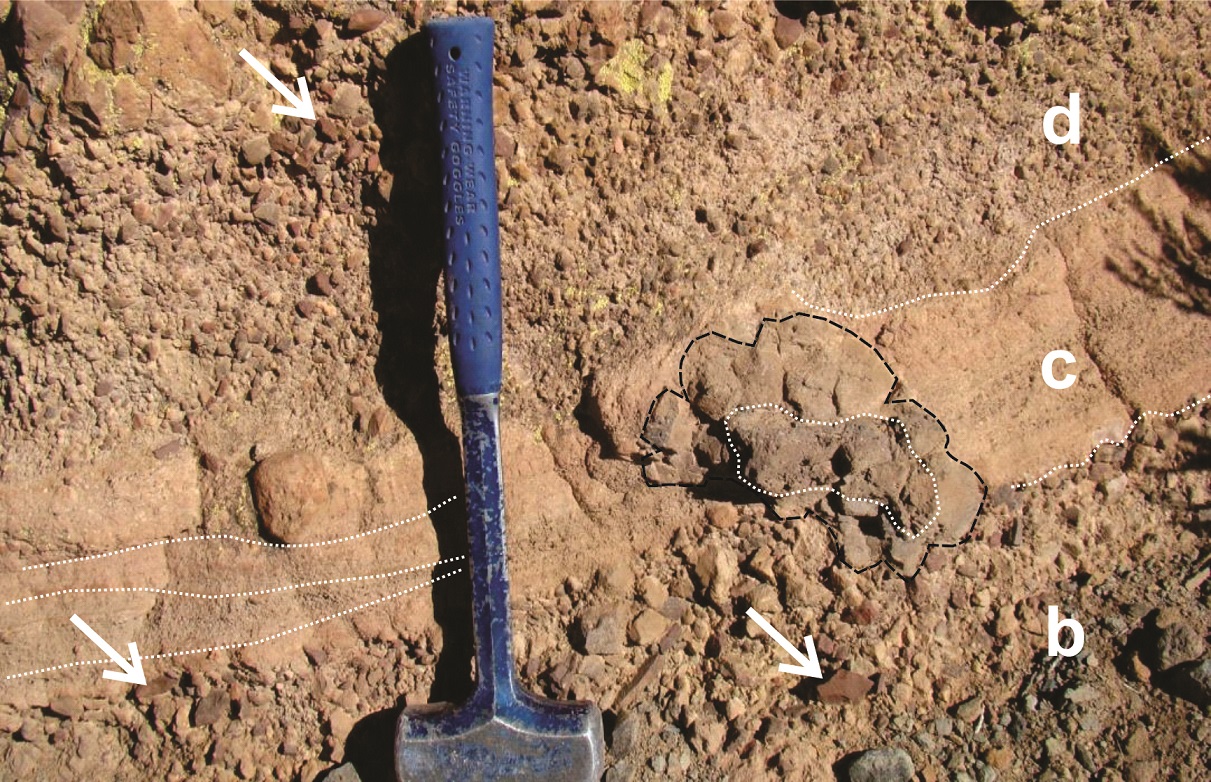Una interpretación alternativa para la litofacies C sería la de un origen por retrabajo de depósitos piroclásticos en un medio fluvial. Sin embargo, hay tres elementos que hacen desestimar esta hipótesis. El primero de ellos es la presencia de bombas de tipo coliflor, que son características de fragmentación de magma máfico por su contacto directo con agua (Fisher y Schmincke, 1984; Belousov et al., 2011). El segundo tiene que ver con el pasaje vertical gradual de las lapillitas y tobas de la litofacies C al depósito primario estromboliano (litofacies A), cuyos componentes tienen características muy semejantes a las de los fragmentos juveniles de la litofacies C, pero mayor granulometría. Dicho pasaje implicaría un simple aumento de la tasa de descarga de magma, suficiente para cambiar en breves instantes la razón magma/agua y por lo tanto la dinámica eruptiva del sistema, ahora gobernado por fragmentación magmática pura, durante una dinámica de estilo estromboliano. Un depósito fluvial, en cambio, difícilmente pudiera pasar transicionalmente a uno magmático sin que queden rastros del abrupto cambio del proceso. Por último, el limitado desarrollo lateral del depósito es más acorde con un proceso de emplazamiento a partir de oleadas discretas (corrientes de densidad piroclásticas localizadas a partir de explosiones dirigidas) que por un sistema fluvial altamente energético y extendido que movilizaría fragmentos de tamaño relativamente grande (ceniza gruesa a lapilli grueso).