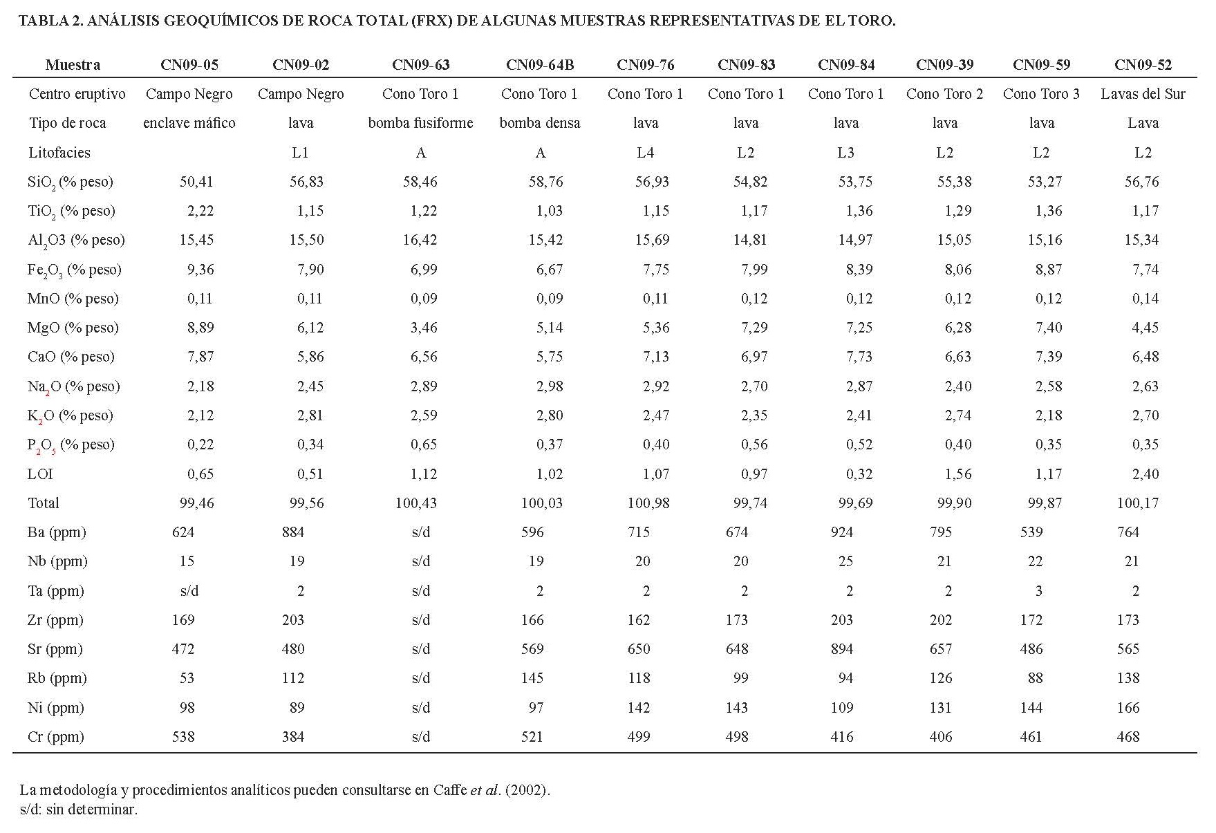 Con el objetivo de clasificar las rocas de El Toro, en la figura 12A se proyectó la composición química de 20 muestras representativas de los centros estudiados (en 16 de ellas se analizaron elementos mayoritarios y traza, y en 4 únicamente elementos mayoritarios), analizadas por FRX en el Laboratorio de Geoquímica del Instituto de Geología y Minería de Jujuy. En la Tabla 2, se exhiben 10 análisis químicos de roca total representativos de las rocas volcánicas de El Toro. La totalidad de los mismos pueden ser consultados en Presta (2011).