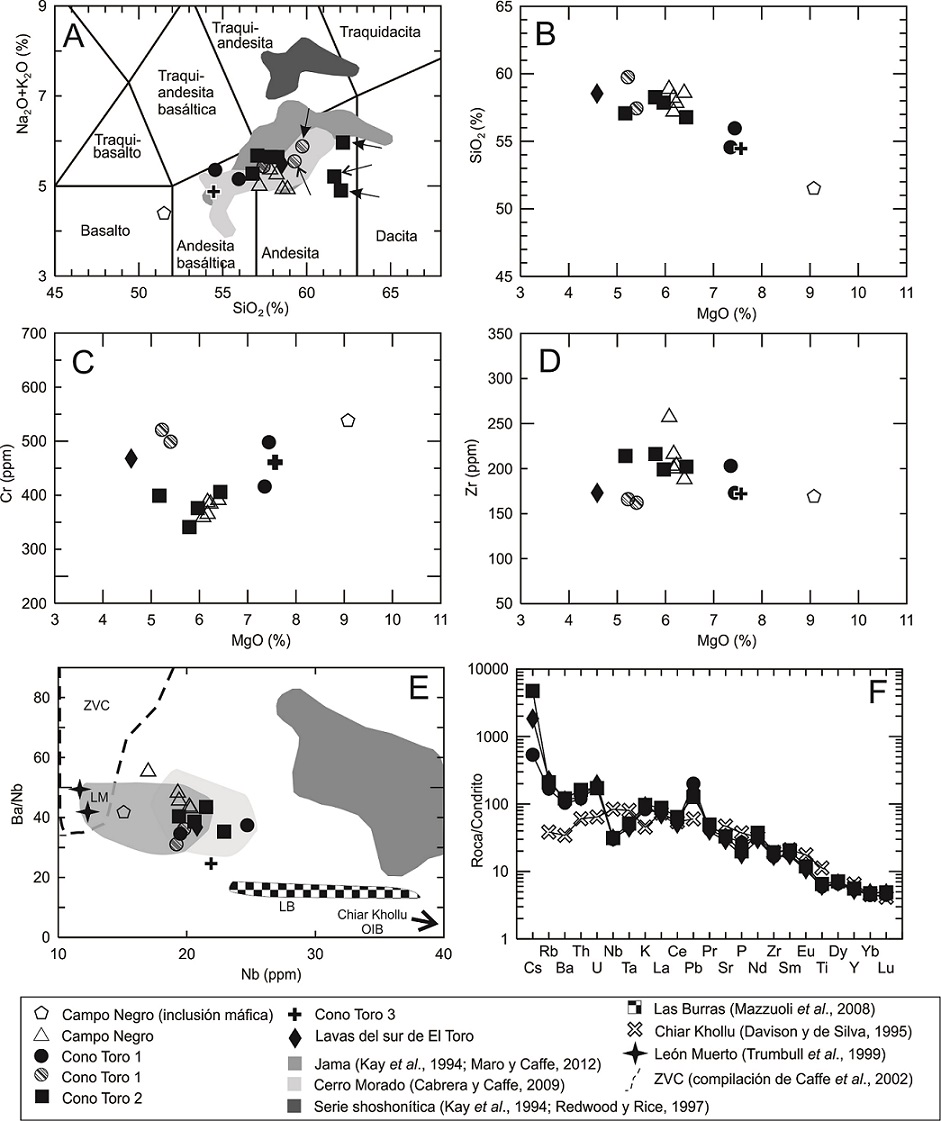 Fig. 12. Composición química de las rocas de El Toro. Los símbolos rellenos con negro representan el grupo petrográfico rico en Ol±Opx; los rayados, el grupo petrográfico con Ol-Cpx-Opx-Hbl; los vacíos, el grupo petrográfico con Pl-Opx-Cpx-Hbl-Bt. A. Clasificación en el diagrama TAS (Le Maitre et al., 1989). Las flechas con punta rellena señalan la composición de bombas densas, mientras que las con punta abierta lo hacen para bombas fusiformes (solo proyectadas en el diagrama TAS); B. Diagrama MgO versus SiO2; C. Diagrama MgO versus Cr; D. Diagrama MgO versus Zr; E. Diagrama Nb (ppm) versus Ba/Nb. Rocas del arco frontal: Andesita León Muerto (LM); Andesitas y dacitas de la Zona volcánica Central andina (ZVC). El complejo plutónico de Las Burras, las shoshonitas de Puna y del Altiplano boliviano más austral y el basalto de Chiar Khollu proyectados para comparación; F. Diagrama extendido de elementos traza normalizado respecto a condrito CI de McDonough y Sun (1995). Los datos de Tierras Raras y Cs de las muestras de El Toro son de Maro (2012)1. |