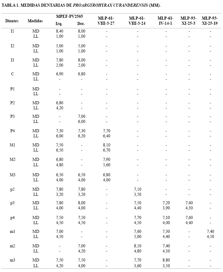 La determinación de los ejemplares, depositados en el Museo Paleontológico Egidio Feruglio (MPEF-PV), se efectuó sobre la base de la comparación anatómica con materiales pertenecientes a las colecciones de distintos museos argentinos (MACN, MLP). Para la correlación geocronológica de las EM se ha seguido a Flynn y Swisher III (1995) y Madden et al. (2010). Abreviaturas. C: canino superior; Der.: derecho; Ix: incisivos superiores; Izq.: izquierdo; LL: diámetro labio-lingual; M: molar superior; m: molar inferior; MD: diámetro mesio-distal; P: premolar superior; p: premolar inferior.