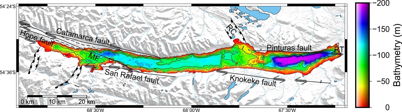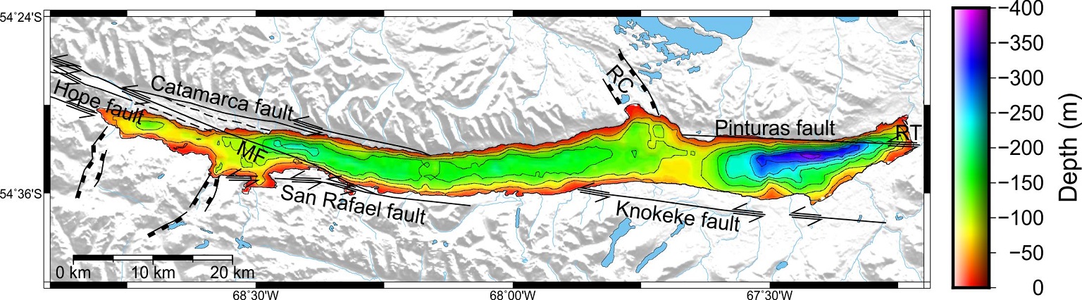 Fig. 4. Simplified bathymetric map of the Lago Fagnano. Depth measured below mean lake water level. The Digital Terrain Model (DTM) of the surroundings has been taken from SRTM v. 4.1 (Farr et al., 2007). Major faults are indicated in black. Locations in figure 5. MF: Martínez fault; RT: Río Turbio fault; RC: Río Claro fault. |