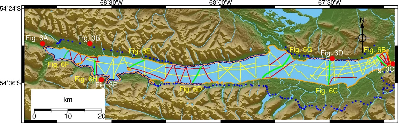 Fig. 5. Seismic position map of the high-resolution profiles acquired in March 2009 (red lines), and profiles (yellow lines) acquired by Waldmann (2008). Numbered green lines are the profiles shown in figure 6. Red dots indicate the photographs location of figure 3. Blue and orange dots correspond to the data off the LF shoreline (limit of the Quaternary glacial deposits and Mesozoic rocks) used to generate the top glacial surfaces and the top basement grids within Lago Fagnano, respectively, following the correlation of the seismostratigraphic and geologic units. See text for details. |