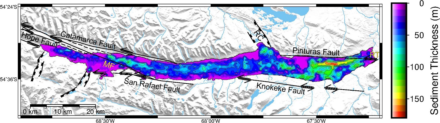 Sedimentary cover is widespread along the LF, being thicker over the basement deepest zone and with a gradually thickening pattern to the east where it reaches a sedimentary thickness of more than 150 m within the eastern pull-apart basin. The major accumulations have elongated shape and filling up the asymmetric pull-apart basins related to the Hope-Catamarca-Knokeke and Río Turbio-Las Pinturas fault.