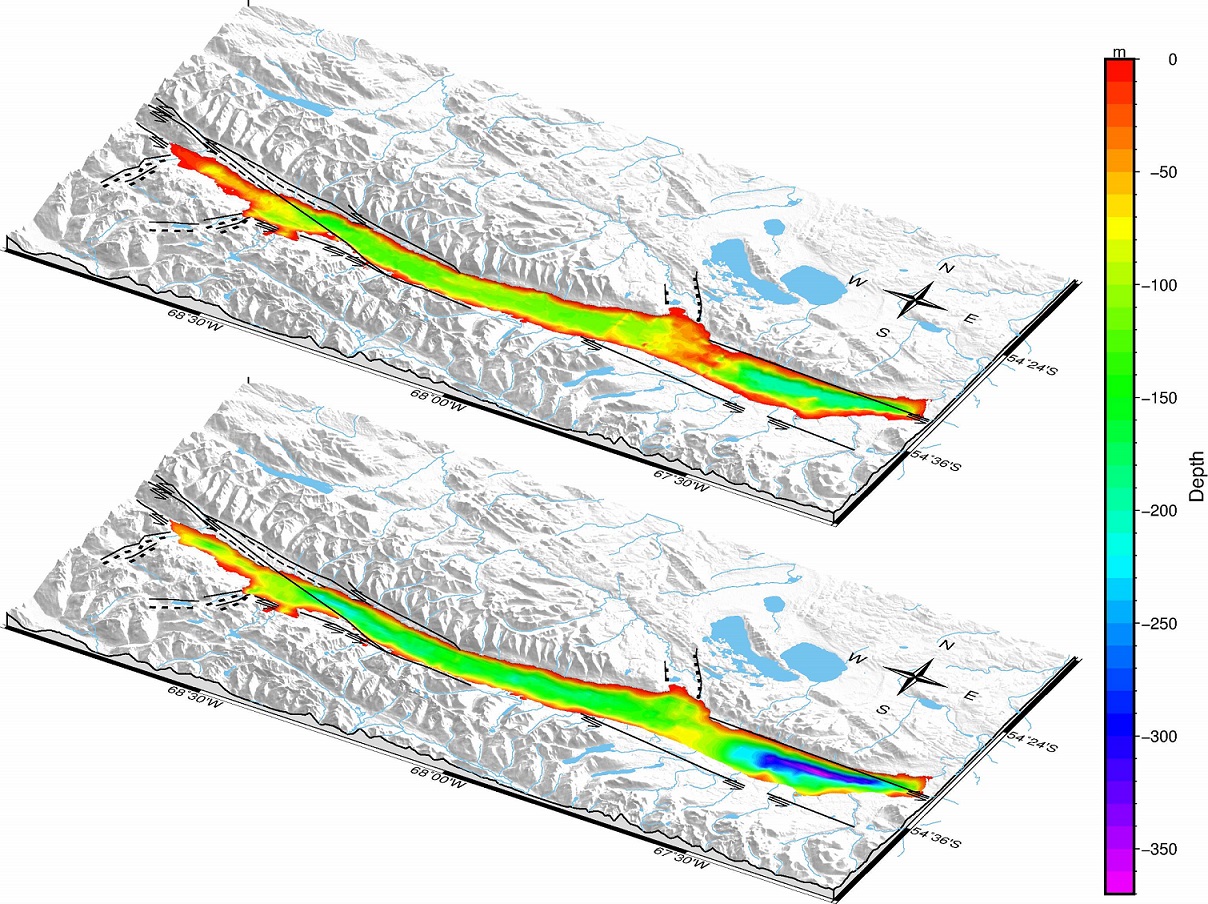 Glacial deposits are present over the entire LF, but preferentially concentrated along the SE margin next to the onland glacial deposits (>100 m thick). Another less important accumulation, also related to onshore deposits, is present in the NW margin (ca. 75 m), near the Río Claro outlet (ca. 40 m), and in the eastern tip of LF (ca. 40 m). In the central and western sector of LF, E-W elongated deposits which correspond to central moraines are present. The lacustrine sediments are preferentially localized along the E-W axis of the lake filling topographic lows. The maximum deposits thickness (ca. 150 m) is located within the eastern pull-apart basin, along and E-W trend parallel to the Río Turbio-Las Pinturas fault.