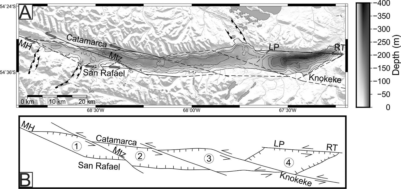 Fig. 12. A. Major faults (observed and inferred) of Lago Fagnano area superimposed onto Digital Elevation Model (SRTM v. 4.1.; Farr et al., 2007) and basement top within the lake. B. Structural sketch of Lago Fagnano composed by 4 pull-apart basins made from the analyzed data. LP: Las Pinturas fault; MH: Monte Hope; Mtz: Martínez Fault; RT: Río Turbio fault. |