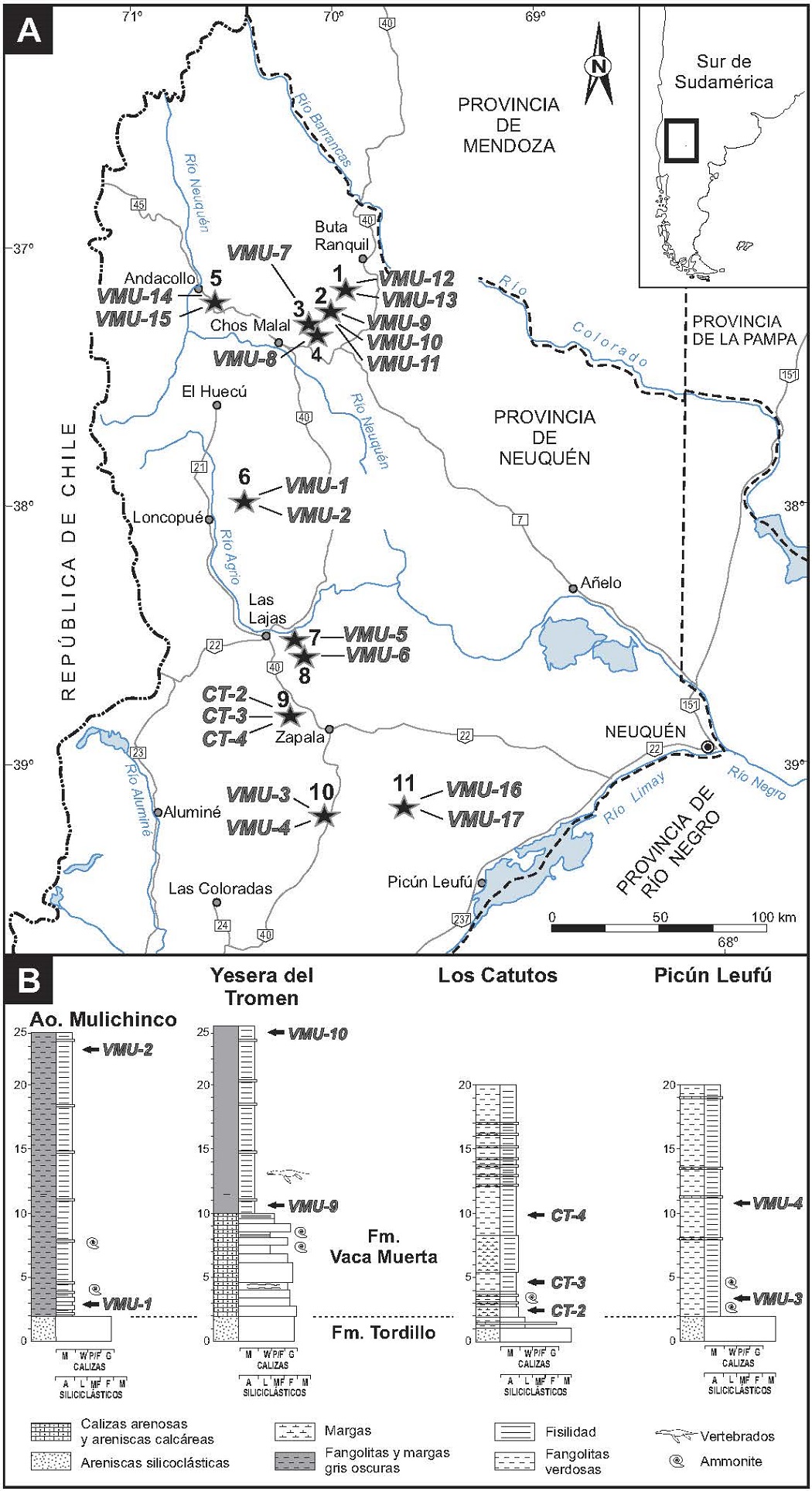 Para caracterizar desde el punto de vista composicional a los depósitos de la sección basal de la Formación Vaca Muerta, se realizó un muestreo de las principales áreas de afloramiento en el sector neuquino de la cuenca (Figs. 1 y 2). En total se colectaron 20 muestras destinadas a análisis geoquímico de componentes inorgánicos. En todos los casos se relevaron niveles de los primeros 25 m de la unidad (Fig.1B). Este intervalo pertenece a las zonas amonitíferas de Mendozanus (Leanza y Hugo, 1978; Leanza, 1981; Leanza et al., 2011) y de Picunleufuense-Mendozanus (Parent et al., 2011a y b), y se asigna al Titoniano Temprano.