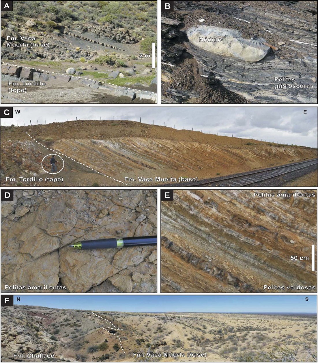 En la mayor parte de la Cuenca Neuquina, los depósitos de la transición del Jurásico-Cretácico se caracterizan por sedimentitas de grano fino (pelitas oscuras bituminosas y margas) de la Formación Vaca Muerta (Weaver, 1931). La base de esta unidad es una superficie isócrona que marca el inicio de la transgresión titoniana (Leanza, 1981), en tanto que su límite superior es progradacional y diacrónico, de modo que su registro comprende períodos más jóvenes a medida que se pasa desde el sector sur (Titoniano medio) al central (Berriasiano-Valanginiano Temprano) de la cuenca (Leanza, 1973, 1981; Leanza y Hugo, 1978; Leanza et al., 1978; Spalletti et al., 2000; Doyle et al., 2005).