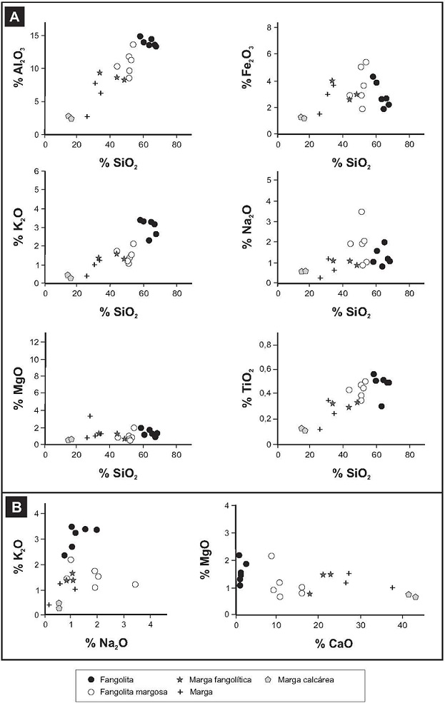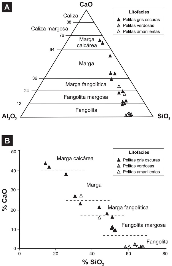 Con la finalidad de ilustrar sobre la existencia de estos tipos litológicos se elaboró el diagrama CaO-Al2O3-SiO2 (Fig. 3A). En él, sobre la base de la confrontación entre los contenidos de CaO y de Al2O3-SiO2, se definen variedades de rocas con extremos en fangolitas y margas calcáreas. Seis muestras son fangolitas, seis fangolitas margosas, tres margas fangolíticas, tres margas y dos margas calcáreas (Tabla 2, Fig. 3A). Estas diferencias también se pueden apreciar en el diagrama de variación CaO versus SiO2 (Fig. 3B) donde existe una muy marcada relación inversa y donde es posible también discriminar entre los tipos litológicos definidos. Comparativamente, las muestras que corresponden a la facies de pelitas verdosas son geoquímicamente fangolitas. En cambio las otras dos facies (pelitas gris oscuras y pelitas amarillentas) muestran una significativa variabilidad composicional, desde tipos silicoclásticos a mixtos (Tabla 2; Fig. 3A y B). Desde el punto de vista de la distribución geográfica, el tipo litológico correspondiente a fangolitas se encuentra casi con exclusividad en el sector sur de la región muestreada (localidades 9 a 11, Fig. 1A). Hacia el norte se presentan tipos litológicos con variable tenor de carbonato de calcio, sin que se registre una tendencia definida.