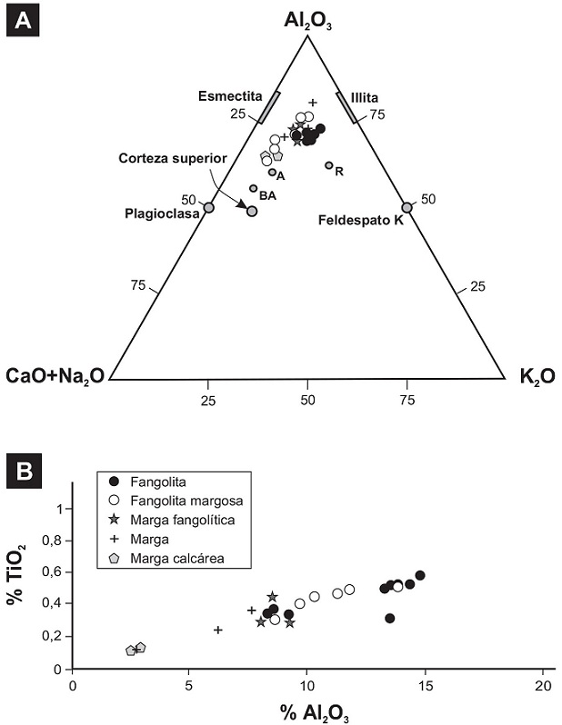 Por su parte, las elevadas cifras de la relación Al2O3/TiO2, siempre superiores a 20 y con un promedio de 29 para las fangolitas (Tabla 1), indican una derivación de rocas andesíticas a riodacíticas y/o granodioríticas a tonalíticas (Zhen et al., 2012), y se considera indicativo de materiales derivados de rocas corticales (Fyffe y Pickerill, 1993).