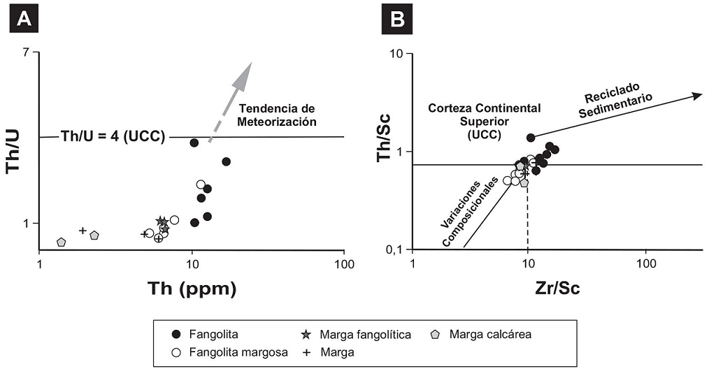 Además de las significativas variaciones en los contenidos de SiO2, Al2O3 y CaO entre las distintas litofacies reconocidas, también se ha determinado que algunos elementos muestran sensibles diferencias entre los tipos litológicos silicáticos y silicáticos-carbonáticos. Entre los componentes mayoritarios, el K2O y el TiO2 registran mayores proporciones en las fangolitas y decrecen a medida que se incrementa el tenor de carbonatos (Figs. 5 y 6B). Uno de los elementos que también resulta discriminatorio entre tipos litológicos es el Sr, dada su afinidad con el Ca (Tabla 1). Muy indicativas son las proporciones de los elementos inmóviles (Th, Lu, Hf, Sc y Zr), todos los cuales muestran sus mayores contenidos en las fangolitas, y decrecen en forma progresiva a medida que se incrementa la participación de carbonato en la roca (Tabla 1). Varias de las relaciones entre elementos están también condicionadas por los tipos litológicos. Los mayores valores del cociente Th/U se registran en las fangolitas mientras que los menores lo hacen en las variedades más carbonáticas (Fig. 7A). La relación Th/Sc refleja esta misma tendencia, ya que las cifras son más altas en las fangolitas, con valores muy cercanos a 1 (Fig. 7B). También es factible deducir que las lutitas son las sedimentitas con más enriquecimiento relativo de Zr en comparación con Sc (Fig. 7B). En definitiva, es muy probable que tanto el Th como el Zr hayan sido preferentemente concentrados en los argilominerales y en fases accesorias, como circón y óxidos de titanio (González López et al., 2005) de las fangolitas.