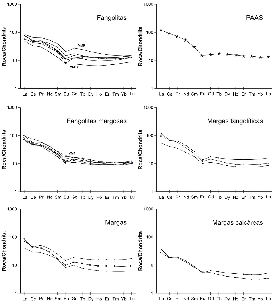 Como se comentara anteriormente, la mayor abundancia de REE en las fangolitas en comparación con las variedades enriquecidas en carbonato (Fig. 8) se considera una medida del aporte silicoclástico al sistema sedimentario (McLennan, 2001; Schulte et al., 2011).