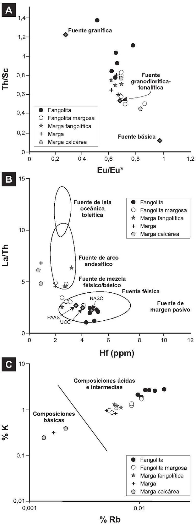 Los mejores indicadores de roca madre en sedimentos son los elementos del grupo de las tierras raras (REE), en especial el Th y el Sc (Taylor y McLennan, 1985; McLennan, 1989), pues sus distribuciones elementales no son afectadas durante los procesos sedimentarios, la diagénesis y el metamorfismo de grado bajo (Bhatia y Crook, 1986; McLennan y Taylor, 1991; Condie, 1993). Las rocas analizadas tienen un perfil de REE similar al de las lutitas post-arqueanas de Australia (PAAS) considerada un promedio para las contribuciones terrígenas (Fig. 8). El enriquecimiento en REE livianos y los bajos valores de los elementos pesados sugieren aportes de rocas félsicas. Además, la marcada anomalía negativa de Eu (Fig. 8) es indicativa de una derivación a partir de un arco magmático emplazado sobre corteza continental (McLennan et al., 1993; Lamaskin et al., 2008). A su vez, las cifras de la relación Eu/Eu*: {Eu/Eu-chondr/[(√Sm/Sm-chondr) x (Gd/Gd-chondr)]}, en especial en las fangolitas en las que varían entre 0,51 y 0,78 (Tabla 1, Fig. 10A), son atribuidas a una derivación a partir de rocas félsicas ácidas a intermedias (graníticas hasta granodioríticas) (Cullers y Podkovirov, 2002; Etamad-Saeed et al., 2011; Zhen et al., 2012).