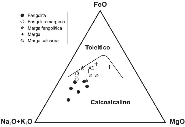 Fig. 11. Diagrama ternario FeO-(Na2O+K2O)-MgO que muestra la ubicación preferencial de las muestras analizadas en campos de rocas ígneas calcoalcalinas. |
