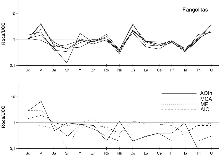 Es claro que la información antes señalada apunta a derivaciones desde rocas ígneas de composiciones intermedias a ácidas. Aun cuando las anomalías positivas de Cs y V de las fangolitas estudiadas, con valores normalizados respecto a la composición de la corteza continental superior (Fig. 9), podrían considerarse indicativas de aportes de rocas máficas (Zhen et al., 2012), en el presente estudio se atribuyen a cuestiones ambientales más que al factor de procedencia (véase 5.6).
