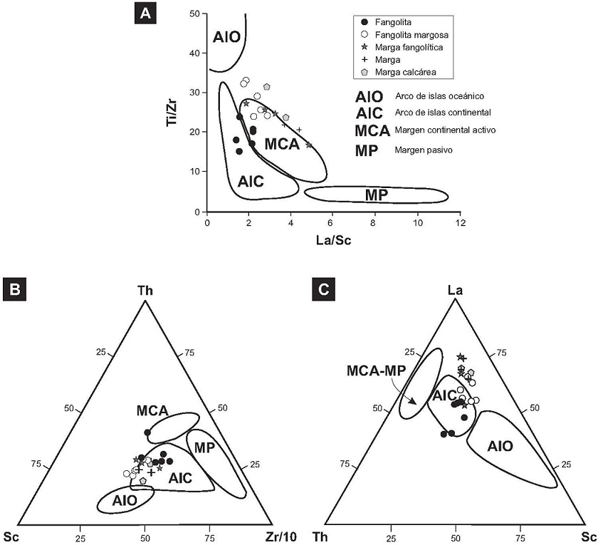 Las cifras de las relaciones entre elementos traza con baja movilidad (Th/Sc promedio 0,77 y La/Sc promedio 2,59, Tabla 1) son mucho más bajas que las que muestran las rocas derivadas de márgenes pasivos que son del orden de 3 y 6, respectivamente (Zhen et al., 2012). Por su parte, el gráfico La/Th versus Hf (Floyd y Leveridge, 1987; Gu et al., 2002) muestra que las fangolitas se ubican en el área correspondiente a una derivación de rocas felsíticas de arco magmático (Fig. 10B). Asimismo, cuando se confrontan Ti/Zr versus La/Sc (Bhatia y Crook, 1986) las fangolitas aparecen distribuidas en las áreas de margen continental activo y de arco magmático continental (Fig. 14A). En los diagramas triangulares Th-Sc-Zr/10 y La-Th-Sc de Bhatia y Crook (1986) las fangolitas se concentran en el campo correspondiente a derivación de arco magmático continental (Fig. 14B y C).