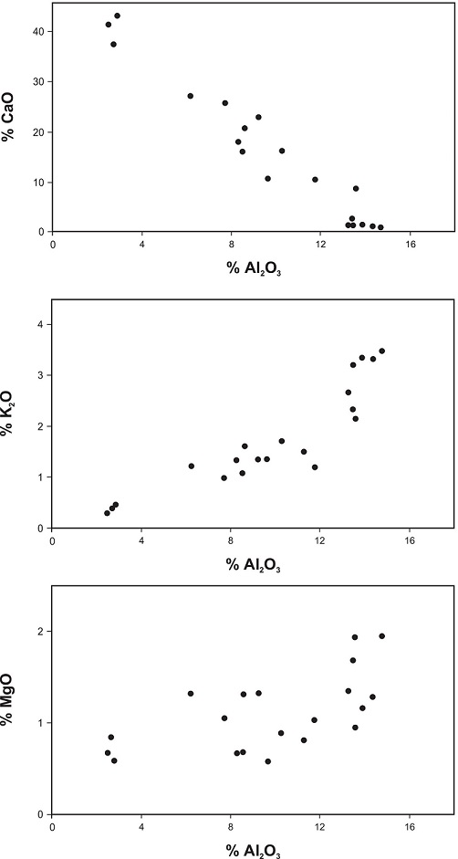 El contenido de algunos elementos mayoritarios (Al, K, Mg y Ti) ha sido empleado para determinar la intensidad de los aportes terrígenos (März et al., 2009). La importante vinculación registrada en las muestras analizadas entre el Al y el Ti (Fig. 6B) tiende a mostrar que ambos elementos resultan buenos indicadores de los aportes terrígenos, incluso alóctono de nutrientes (Trabucho-Alexandre et al., 2012). Son asimismo positivas las relaciones de Al2O3 con el K2O y el MgO (Fig. 15), y las rocas con altos contenidos de esos elementos pueden también reflejar la intensidad de los aportes terrígenos. En particular, la relación entre K2O versus Al2O3 puede considerarse una medida de la contribución de argilominerales a la cuenca (Ratcliffe et al., 2012) y por ende de los aportes de productos de meteorización. No obstante, debe tenerse en cuenta que tanto el potasio como el magnesio pueden haber sido captados del agua de mar (März et al., 2009), por lo que resultan indicadores menos seguros de aportes detríticos. Por su parte, la fuerte correlación negativa entre el Al2O3 y el CaO (Fig. 15) refleja la dilución mutua entre los aportes detríticos a la cuenca y la producción de material biogénico (März et al., 2009).