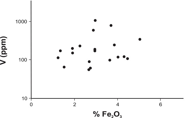 Fig. 16. Diagrama bivariado V versus Fe2O3. Las muestras de la Formación Vaca Muerta no manifiestan una clara relación entre estos componentes. |