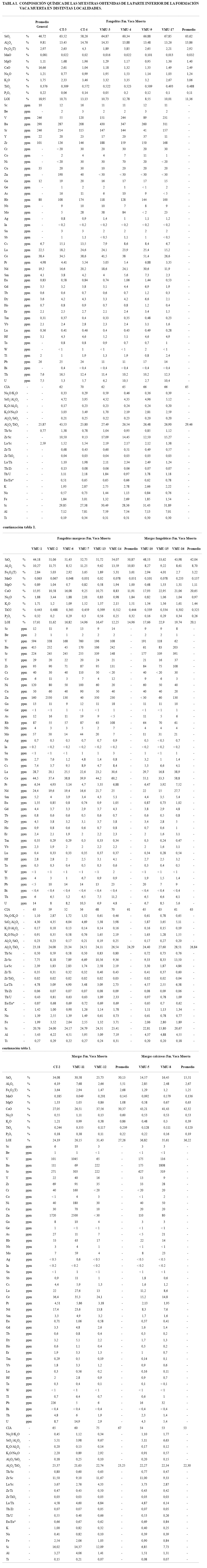 Los resultados del análisis químico de los elementos mayoritarios muestran importantes variaciones en los tenores de SiO2 y de CaO principalmente (Tabla 1). Ello se debe sin dudas a la existencia de distintos tipos litológicos, uno enteramente silicático y otros en los que predomina la mezcla de componentes silicáticos y carbonáticos. Se considera que la mayor parte de los componentes carbonáticos tienen origen intracuencal y son el resultado de la actividad biogénica.