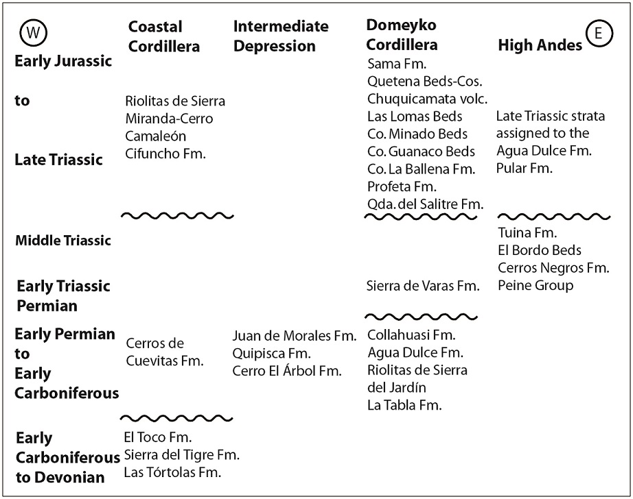Breitkreuz, C.; Zeil, W. 1994. The Late Carboniferous to Triassic Volcanic Belt in Northern Chile. In Tectonics of the Southern Andes (Reutter, K.J.; Scheuber, E.; Wigger, P.J.; editors). Springer: 277-292.