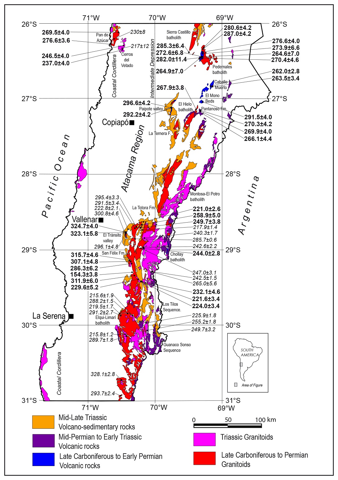 The correct allocation of lithostratigraphic units to the geological time results in changes in the stratigraphy modifying the tectonic interpretation and evolution of the studied volcano-plutonic event. The current U-Pb data allow a better understanding of the temporal evolution of the Late Paleozoic to Early Jurassic volcano-plutonic event in northern Chile, but certainly further work is required to solve particularly stratigraphic problems still remaining and some outcrops that have not been sampled by logistic reasons.