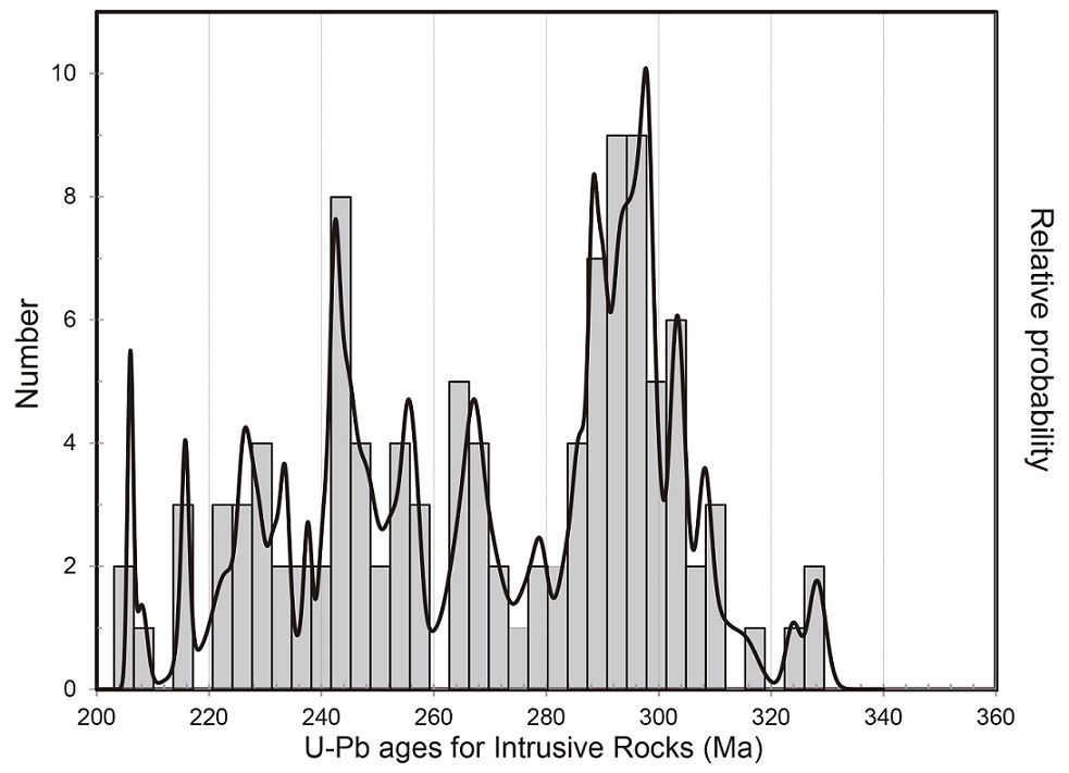 U-Pb geochronological data for Late Paleozoic to Early Mesozoic rocks compiled from previous studies are presented in Tables 1 and 2 and figures 3 and 4.