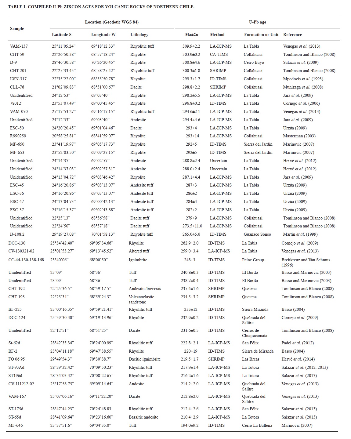 The oldest zircon U-Pb ages compiled for volcanic rocks range from 309.9±2.2 to 273.5±11.0 Ma (Table 1; Fig. 3); these rocks are exposed from 20°30’ to 25°30’S in a ~50 km wide, longitudinal belt along ~69°W longitude along the Precordillera and the Domeyko Cordillera (Fig. 3), and according to the U-Pb data represent a Late Carboniferous to Early Permian, felsic volcanism and subordinate intermediate and basic volcanic rocks, and minor sedimentary intercalations (Collahuasi, Agua Dulce and La Tabla Formations, and the Sierra del Jardín Rhyolites; Vergara and Thomas, 1984; Mpodozis et al., 1993; Marinovic and García, 1999; Masterman, 2003; Cornejo et al., 2006; Marinovic, 2007; Munizaga et al., 2008; Tomlinson and Blanco, 2008; Urzúa, 2009; Jara et al., 2009; Hervé et al., 2012). The Late Carboniferous to Early Permian volcanism is less known southward of 25°30’S, but a U-Pb zircon age of 300.8±4.6 Ma has been reported by Salazar et al. (2013) for rhyolites outcropping in the El Tránsito river valley in the High Andes, 65 km west of the divide (28°46’S; Fig. 4).