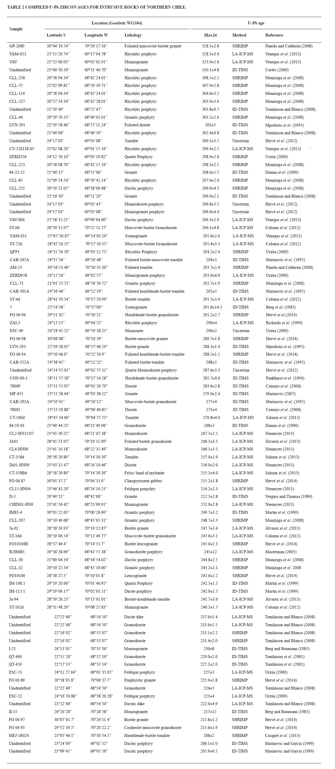 The new U-Pb data from 277 to 237 Ma (Table 4) confirm that Permian and Mid-Triassic granitic magmatism is also exposed in the current coastal area, which combined with previously published geochronological data suggests a protracted plutonism extending from 322 to 217 Ma along the Coastal Cordillera of northern Chile from 21° to 33°S (Maksaev and Marinovic, 1980; Skarmeta and Marinovic, 1981; Berg et al., 1983; Shibata et al., 1984; Berg and Baumann, 1985). However, there appears to be a difference with the Coastal Batholith exposed to the south between 33° to 38°S, which has yielded eight 320 to 300 Ma (Pennsylvanian) U-Pb zircon ages (Deckart et al., 2014), but to date there are no Permian and Early Triassic granitoids intruded in the main body of this Coastal Batholith of central-southern Chile, and only some small Late Triassic-Early Jurassic stocks of calc-alkaline to transitional A-type affinities, with U-Pb zircon ages from 225 to 197 Ma that are emplaced into its metamorphic envelope (Vásquez et al., 2011; Hervé et al., 2014).