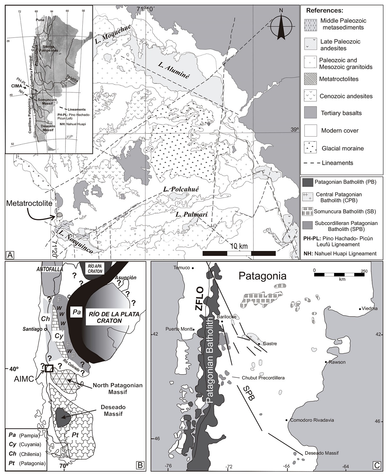 The pre-Andean tectonic context for the AIMC, is represented in figure 1B. The AIMC is located within a complex tectonic framework. According to Vaughan and Pankhurst (2008), the sector between 38° and 40°S presents a high grade of complexity due to the scarcity of detailed information, from what they marked this area with a question mark. This zone limits to the north with the Chilean and Cuyanean terranes, whereas towards the south it is in contact with the North Patagonian Massif and Patagonia. The tectonic Andean frame also presents a high grade of complexity due to the successive emplacement of igneous bodies forming different batholiths. The Patagonian Batholith (PB), located between 38º30’S and 56ºS, records the Andean subducción initiation at around 150 Ma ago, in the Jurassic period (Hervé et al., 2007). The northern portion of the PB is named North Patagonian Batholith (NPB). Previously, Gordon and Ort (1993), had called Subcordilleran Patagonian Batholith (SCB) to the jurassic granitic rocks arranged in a NNE trend. Same authors named Cordilleran Patagonian Batholith (CPB) to the cretaceous granitic rocks distributed along the N-S direction (Fig. 1C). The locations of the Central Patagonian Batholith (CPB) and the Somuncurá Batholith (SB), are showed in figure 1C. In spite of in figure 1C outcrops of the PB and SCB are only showed to occur to the south of 40°S, rocks corresponding to these batholiths can be recognized up to the 38º30’S (Urraza et al., 2011).