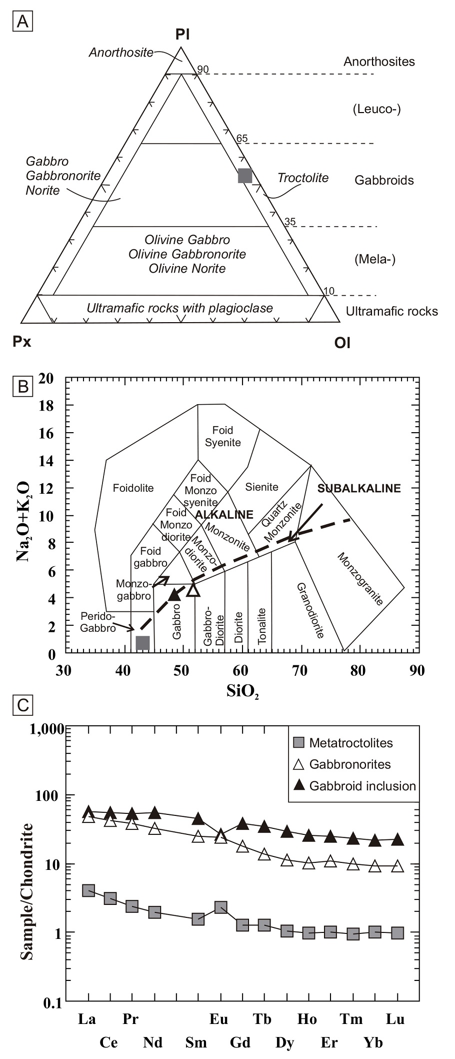 Fig. 4. A. Modal classification based on the proportions of plagioclase, pyroxene and olivine; B. TAS Diagram (whole alkalis versus silica) of Cox et al. (1979), adapted by Wilson (1989) and Middlemost (1994) for plutonic rocks. The studied samples lie inside the subalkaline area, and within the perido-gabbros field; C. REE composition of metatroctolites, gabbronorites and gabbroic inclusions in granodiorites normalized to Boynton (1984). |