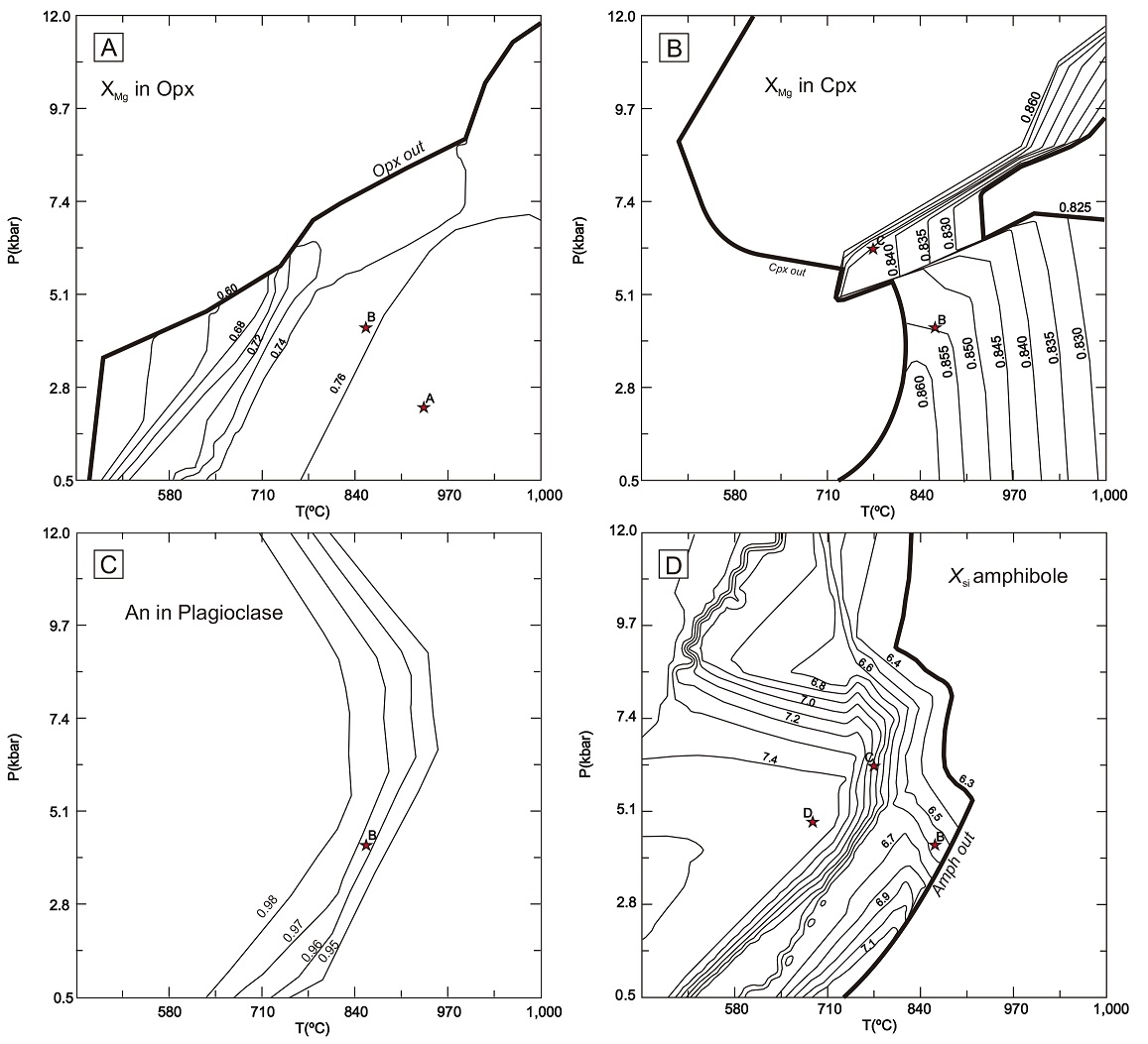 The conditions of the point B in figure 8, were calculated through the geothermometer TB of Holland and Blundy (1994), using the mineral pair Pl2-Hbl1 and the Al-in-Hbl geobarometer of Johnson and Rutherford (1989) for Hbl1, obtaining a temperature of 851 ºC and a pressure of 4.26 Kb. Point B lies in the stability field of the association Ol+Pl+Cpx+Opx+Hbl1+H2O, and differs from the previous one for the first appearance of the amphibole (Hbl1). The trajectory between points A and B implies increasing pressures and decreasing temperatures, and requires of the availability of free water to form amphibole. The P-T condition of stage B is well constrained by the compositional isopleths of XMg in Opx (0.77), as well as in Cpx XMg=0.85 (Fig. 9A, B). Anorthite proportions in Pl for the stage B is around (XCa=0.96), whose composition is the same as that obteined for Pl2 with microprobe analysis. XSi in amphibole varies between 6.5 and 6.6 (a.p.f.u) (Fig. 9 C and D). The estimated isopleths are fully coincident with the P-T conditions obtained for stage B using classical geothermobarometry.