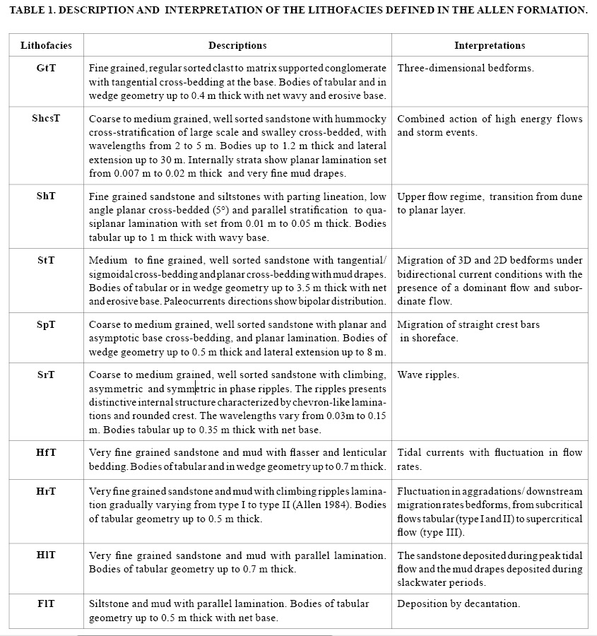 6. ConclusionsIn stratigraphic sections of the Allen Formation of the study area, ten lithofacies (one conglomeratic, five of sandstones, three heterolithics and one pelitic) were identified, which allowed the definition of four facies associations, which were interpreted as tidal channels, intertidal flat, subtidal flat, storm-influenced tidal flat and shoreface deposits.